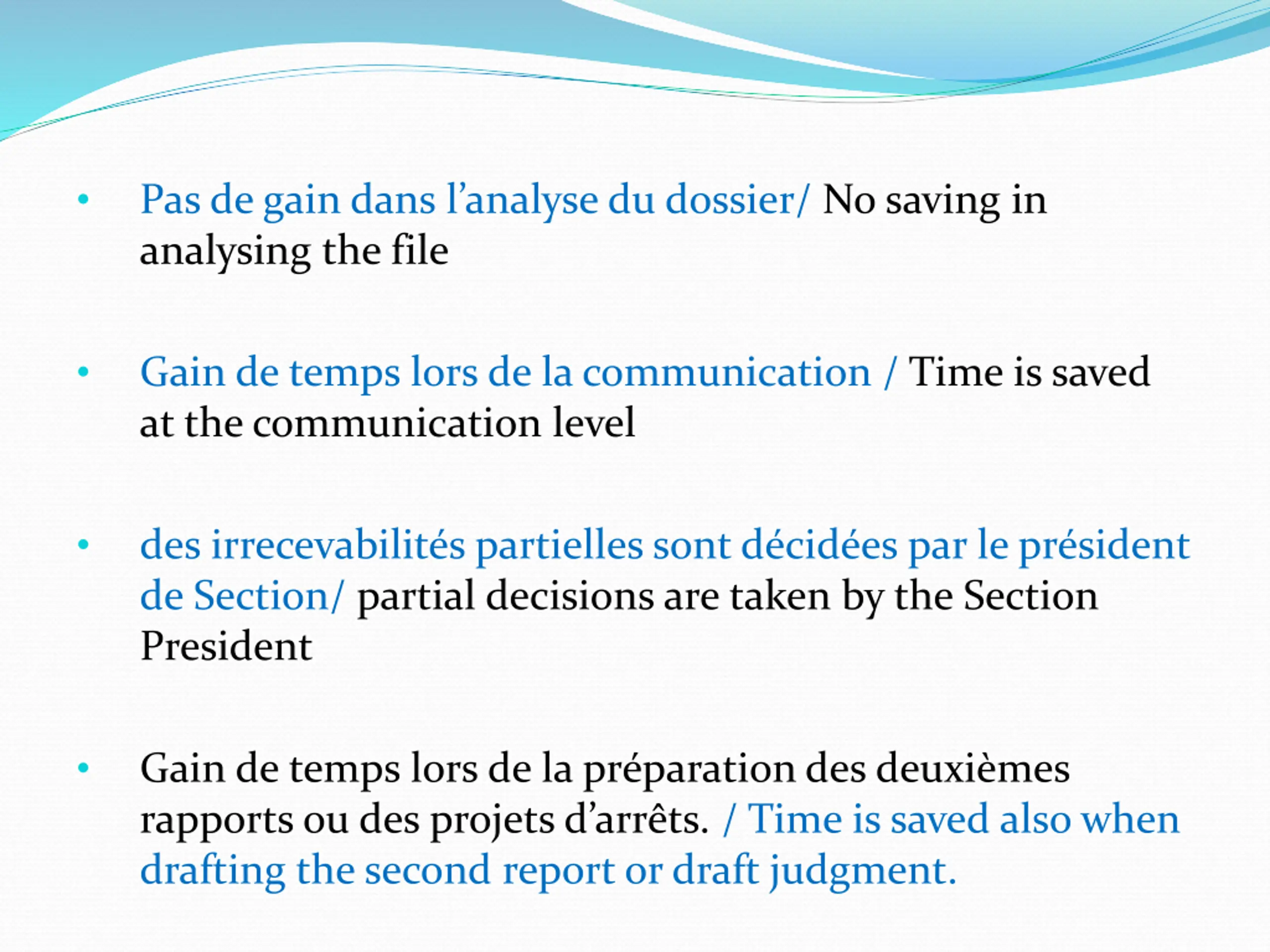 Pas de gain dans l analyse du dossier/ No saving in analysing the file Gain de temps lors de la communication / Time is saved at the communication level des irrecevabilit s partielles sont d cid es par le pr sident de Section/ partial decisions are taken by the Section President Gain de temps lors de la pr paration des deuxi mes rapports ou des projets d arr ts. / Time is saved also when drafting the second report or draft judgment.