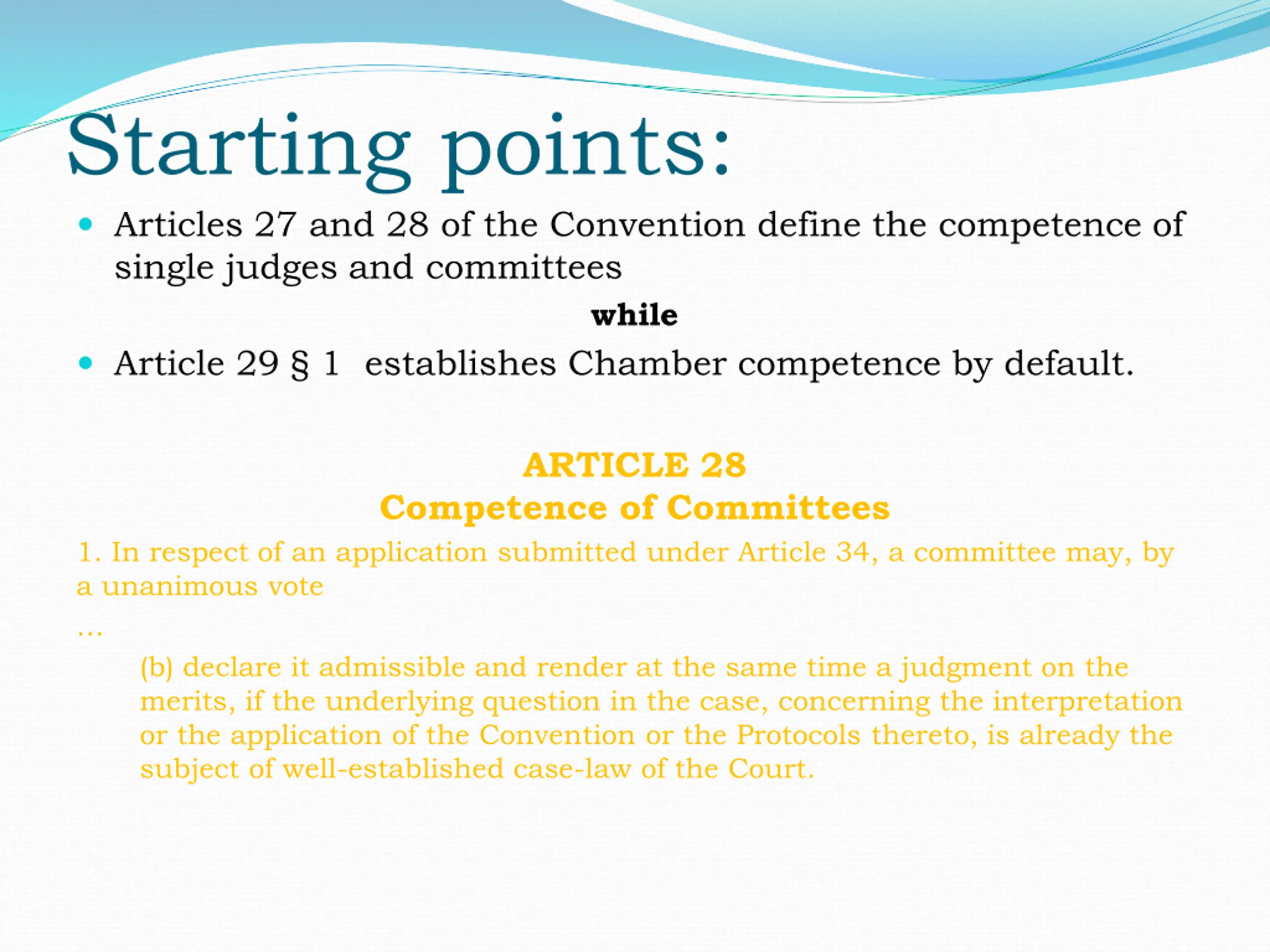 Starting points: Articles 27 and 28 of the Convention define the competence of single judges and committees while Article 29 1 establishes Chamber competence by default. ARTICLE 28 Competence of Committees 1. In respect of an application submitted under Article 34, a committee may, by a unanimous vote (b) declare it admissible and render at the same time a judgment on the merits, if the underlying question in the case, concerning the interpretation or the application of the Convention or the Protocols thereto, is already the subject of well-established case-law of the Court.