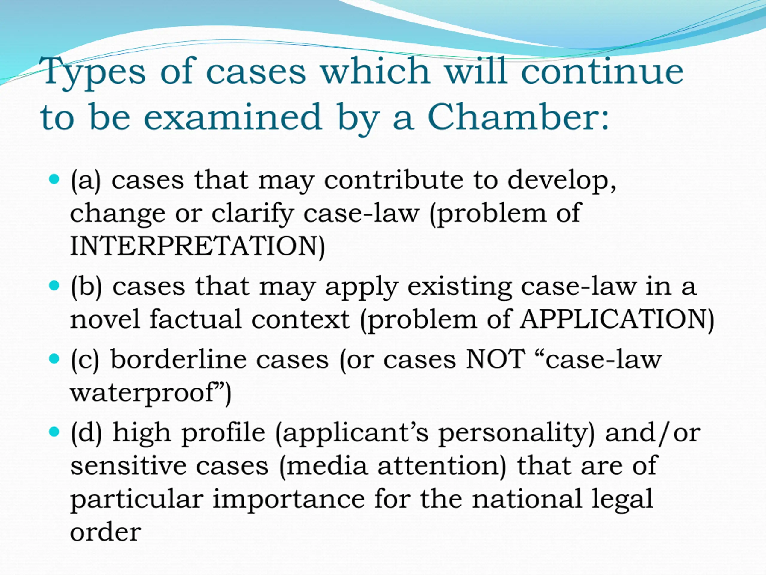 Types of cases which will continue to be examined by a Chamber: (a) cases that may contribute to develop, change or clarify case-law (problem of INTERPRETATION) (b) cases that may apply existing case-law in a novel factual context (problem of APPLICATION) (c) borderline cases (or cases NOT case-law waterproof ) (d) high profile (applicant s personality) and/or sensitive cases (media attention) that are of particular importance for the national legal order