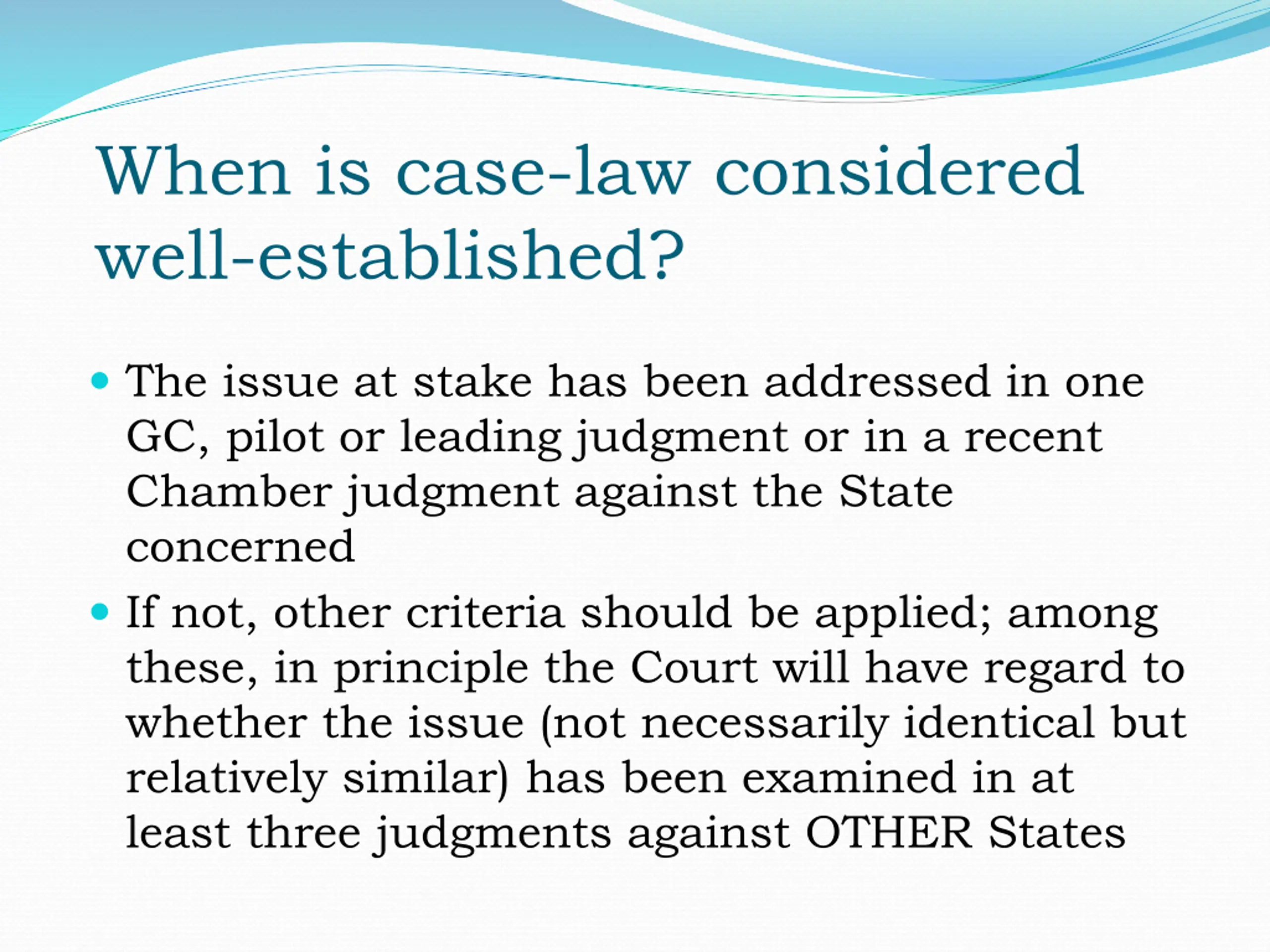 When is case-law considered well-established? The issue at stake has been addressed in one GC, pilot or leading judgment or in a recent Chamber judgment against the State concerned If not, other criteria should be applied; among these, in principle the Court will have regard to whether the issue (not necessarily identical but relatively similar) has been examined in at least three judgments against OTHER States