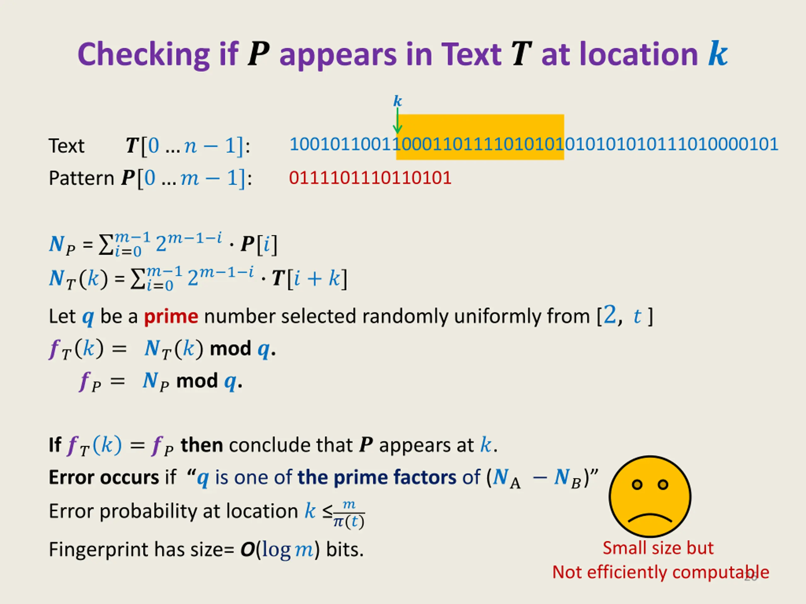 Checking if ? appears in Text ? at location ? ? Text ?[0 ? 1]: Pattern ?[0 ? 1]: 100101100110001101111010101010101010111010000101 0111101110110101 ? 12? 1 ? ?[?] ? 12? 1 ? ?[? + ?] ?? = ?=0 ??(?) = ?=0 Let ? be a prime number selected randomly uniformly from [2,? ] ??? = ??(?) mod ?. ??= ?? mod ?. If??? =??then conclude that ? appears at ?. Error occurs if ? isone of the prime factors of(?A ??) Error probability at location ? ?(?) Fingerprint has size= O(log?) bits. ? Small size but Not efficiently computable 26