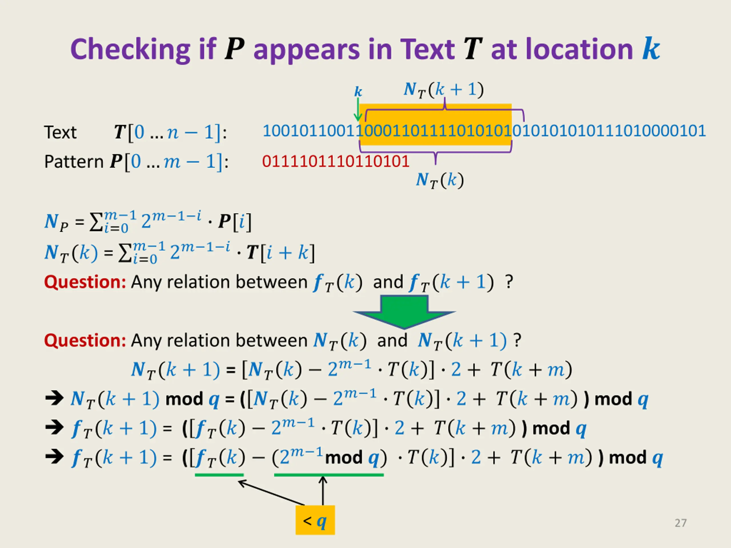 Checking if ? appears in Text ? at location ? ??(? + 1) ? Text ?[0 ? 1]: Pattern ?[0 ? 1]: 100101100110001101111010101010101010111010000101 0111101110110101 ??(?) ? 12? 1 ? ?[?] ? 12? 1 ? ?[? + ?] ?? = ?=0 ??(?) = ?=0 Question: Any relation between ??(?) and ??(? + 1) ? Question: Any relation between ??(?) and ??(? + 1) ? ??(? + 1) = ??? 2? 1 ? ? ??(? + 1) mod ? = ( ??? 2? 1 ? ? ??(? + 1) = ( ??? 2? 1 ? ? ??(? + 1) = ( ??? (2? 1mod?) ? ? 2 + ? ? + ? 2 + ? ? + ?)mod? 2 + ? ? + ?)mod? 2 + ? ? + ?)mod? < ? 27