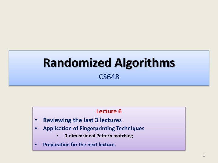 Randomized Algorithms CS648 Lecture 6 Reviewing the last 3 lectures Application of Fingerprinting Techniques 1-dimensional Pattern matching Preparation for the next lecture. 1
