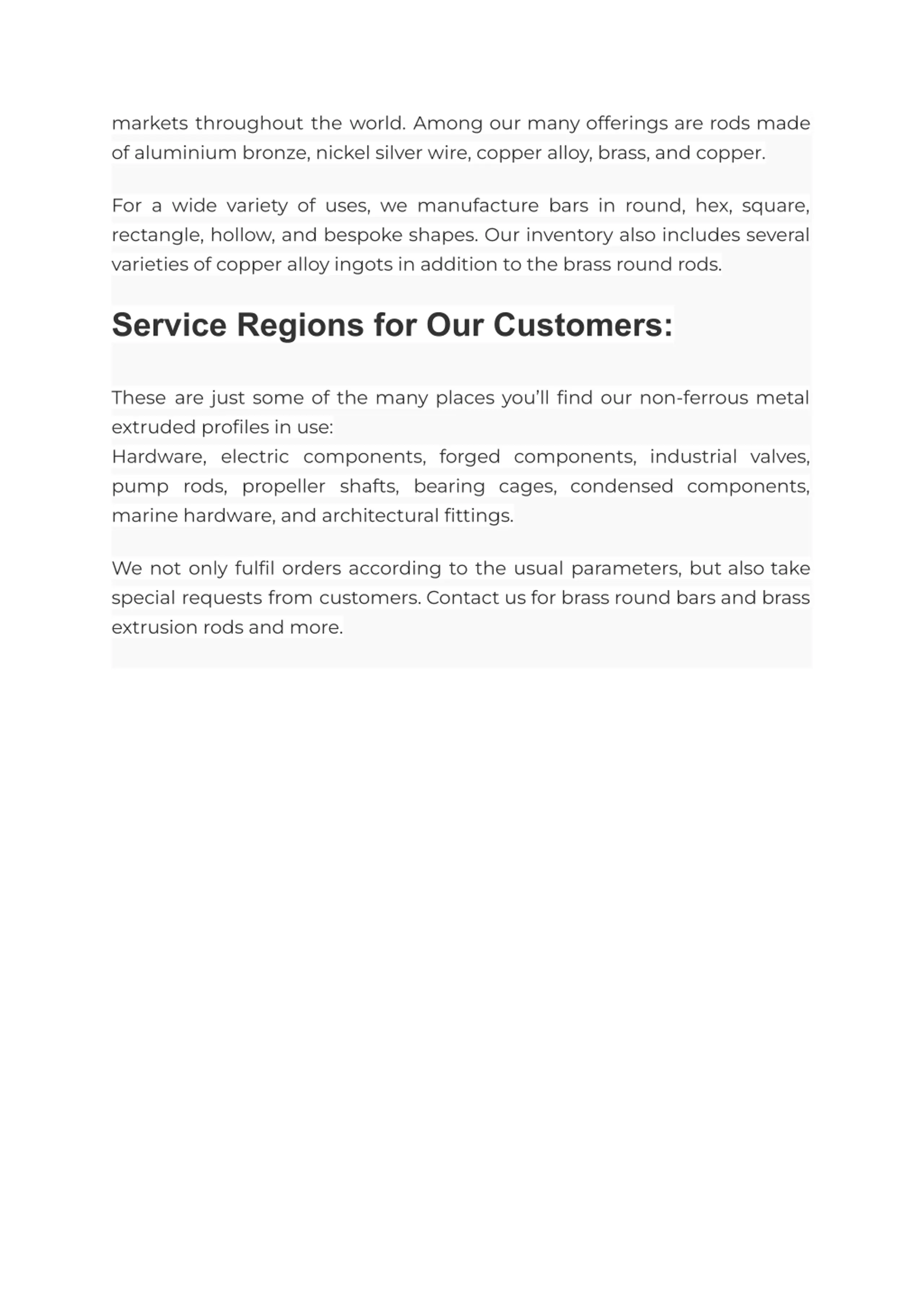 markets throughout the world. Among our many offerings are rods made of aluminium bronze, nickel silver wire, copper alloy, brass, and copper. For a wide variety of uses, we manufacture bars in round, hex, square, rectangle, hollow, and bespoke shapes. Our inventory also includes several varieties of copper alloy ingots in addition to the brass round rods. Service Regions for Our Customers: These are just some of the many places you ll find our non-ferrous metal extruded profiles in use: Hardware, electric components, forged components, industrial valves, pump rods, propeller shafts, bearing cages, condensed components, marine hardware, and architectural fittings. We not only fulfil orders according to the usual parameters, but also take special requests from customers. Contact us for brass round bars and brass extrusion rods and more.