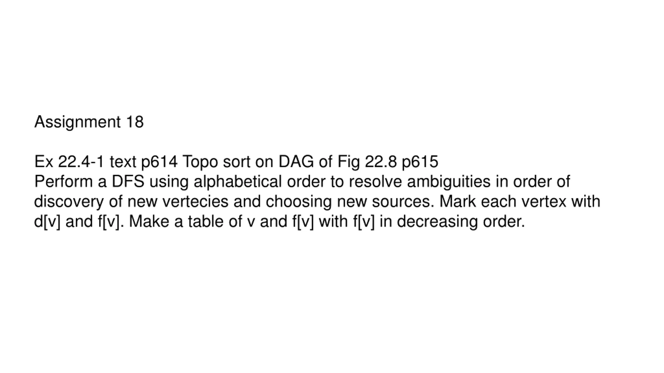 Assignment 18 Ex 22.4-1 text p614 Topo sort on DAG of Fig 22.8 p615 Perform a DFS using alphabetical order to resolve ambiguities in order of discovery of new vertecies and choosing new sources. Mark each vertex with d[v] and f[v]. Make a table of v and f[v] with f[v] in decreasing order.