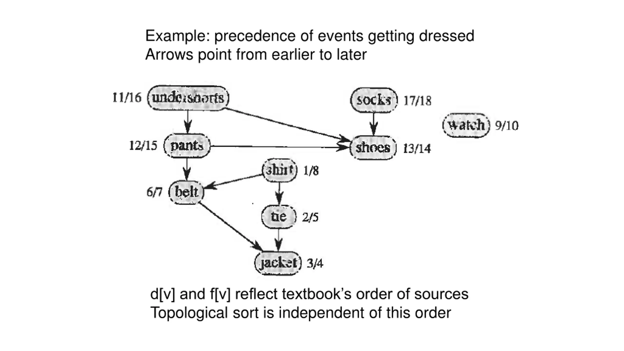 Example: precedence of events getting dressed Arrows point from earlier to later d[v] and f[v] reflect textbook s order of sources Topological sort is independent of this order