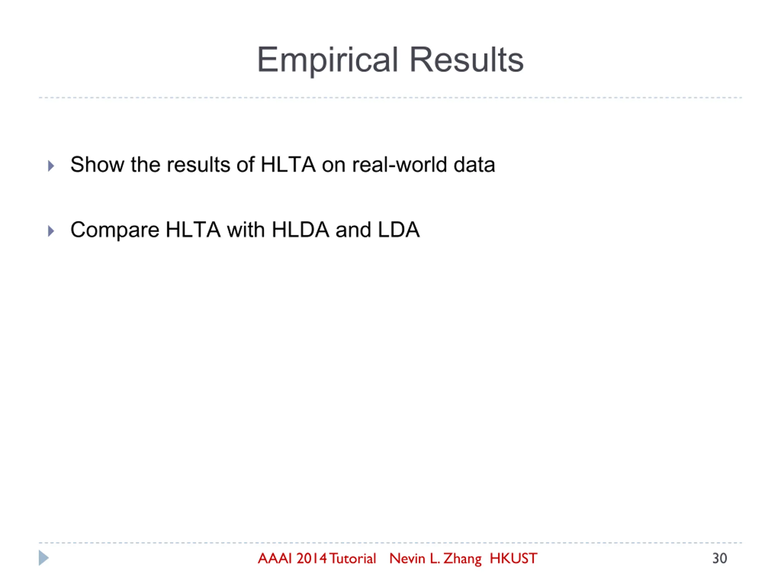 Empirical Results Show the results of HLTA on real-world data Compare HLTA with HLDA and LDA AAAI 2014 Tutorial Nevin L. Zhang HKUST 30