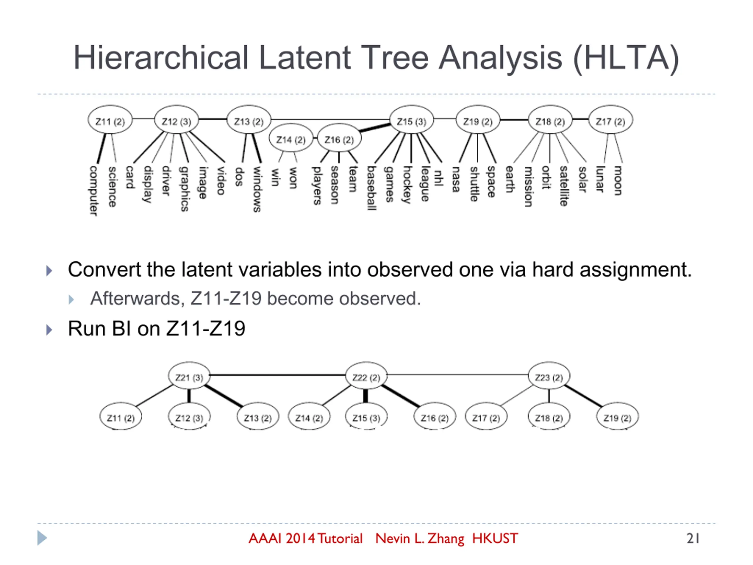 Latent Tree Model for a Subset of Newsgroup Data Latent variable give miniature topics. Intuitively, more interesting topics can be detected if we combine Z11, Z12, Z13 Z14, Z15, Z16 Z17, Z18, Z19 BI algorithm produces flat models: Each latent variable directly connected to at least one observed variables. AAAI 2014 Tutorial Nevin L. Zhang HKUST 20