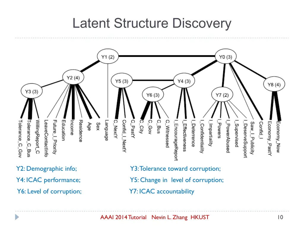 Latent Structure Discovery Y2: Demographic info; Y3: Tolerance toward corruption; Y4: ICAC performance; Y5: Change in level of corruption; Y6: Level of corruption; Y7: ICAC accountability AAAI 2014 Tutorial Nevin L. Zhang HKUST 10