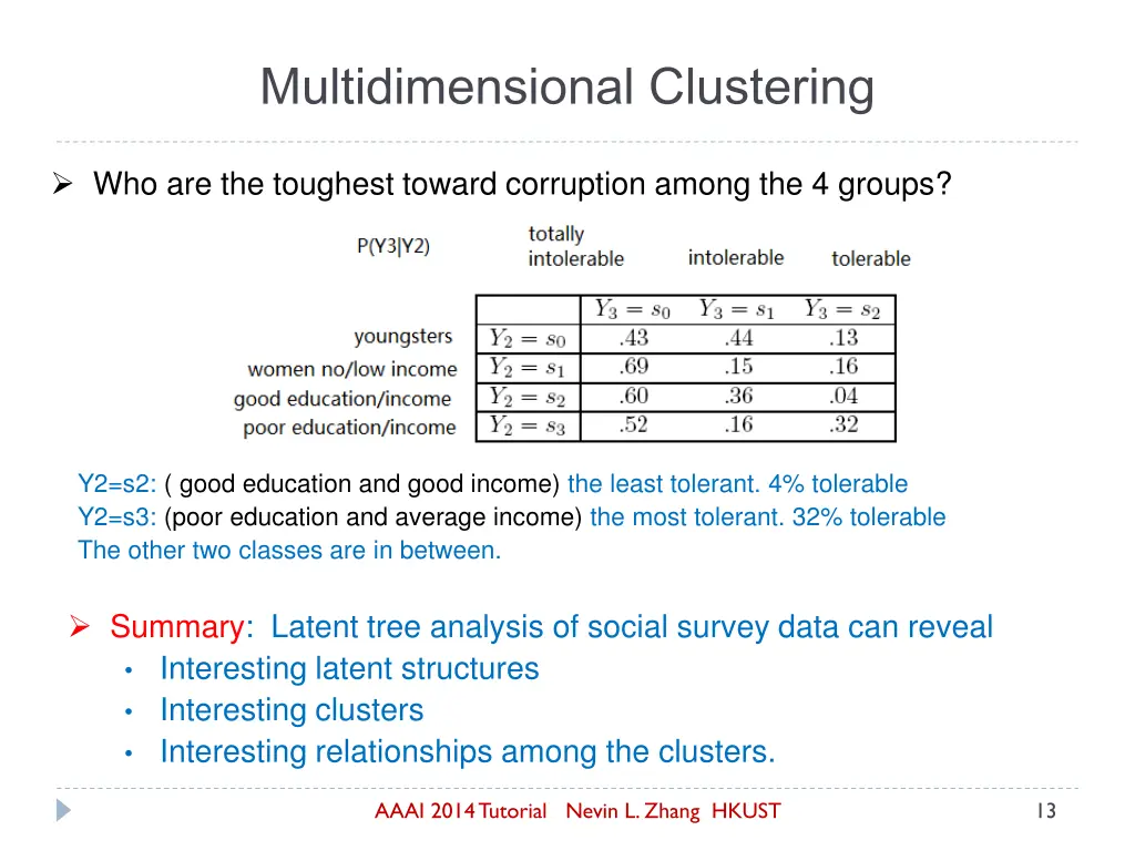 Multidimensional Clustering Y3=s0: people who find corruption totally intolerable; 57% Y3=s1: people who find corruption intolerable; 27% Y3=s2: people who find corruption tolerable; 15% Interesting finding: Y3=s2: 29+19=48% find C-Gov totally intolerable or intolerable; 5% for C-Bus Y3=s1: 54% find C-Gov totally intolerable; 2% for C-Bus Y3=s0: Same attitude toward C-Gov and C-Bus People who are tough on corruption are equally tough toward C-Gov and C-Bus. People who are lenient about corruption are more lenient C-Bus than C-GOv AAAI 2014 Tutorial Nevin L. Zhang HKUST 12