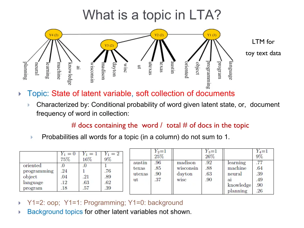 What is a topic in LTA? LTM for toy text data Topic: State of latent variable, soft collection of documents Characterized by: Conditional probability of word given latent state, or, document frequency of word in collection: # docs containing the word / total # of docs in the topic Probabilities all words for a topic (in a column) do not sum to 1. Y1=2: oop; Y1=1: Programming; Y1=0: background Background topics for other latent variables not shown.