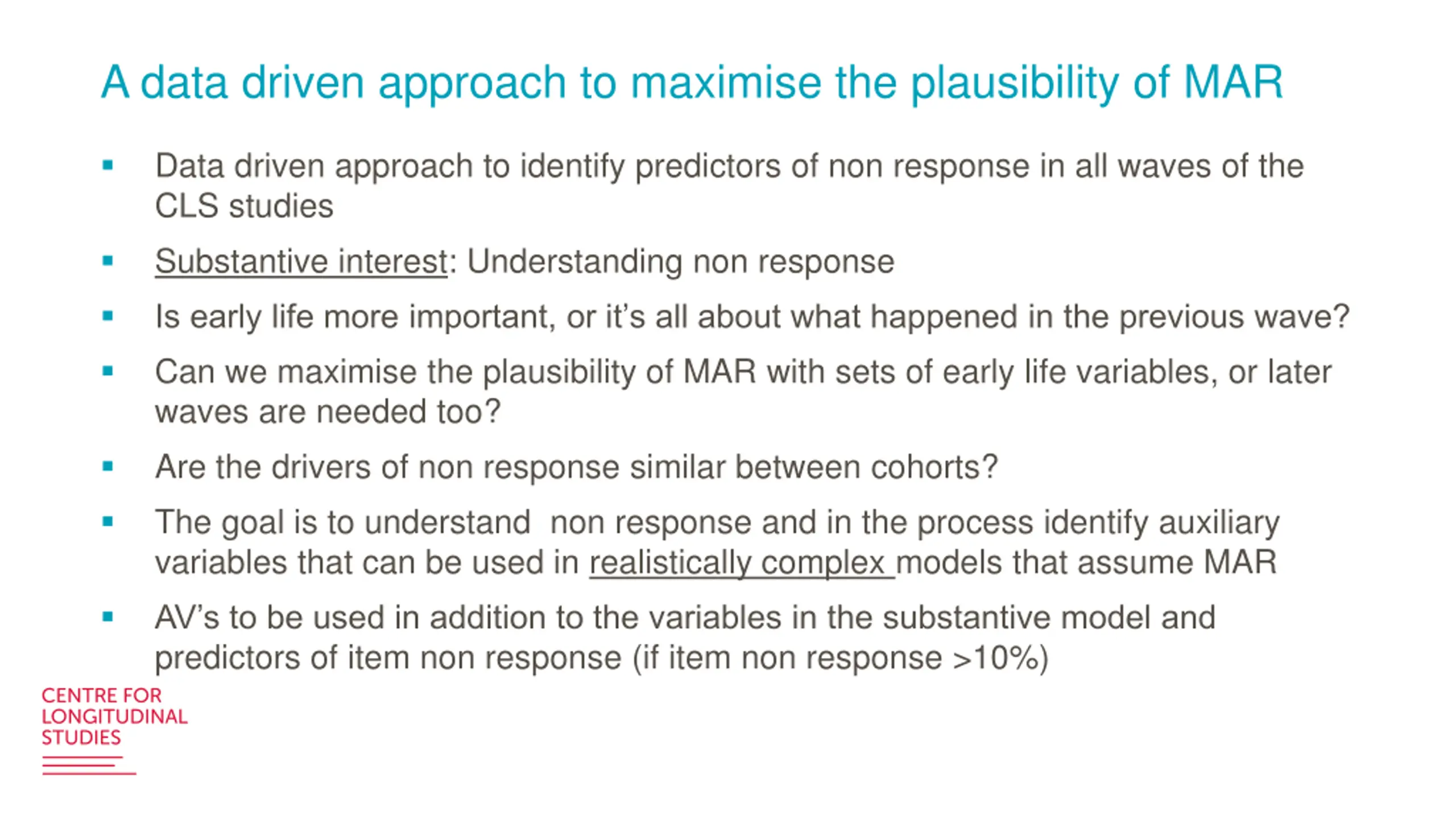 A data driven approach to maximise the plausibility of MAR Data driven approach to identify predictors of non response in all waves of the CLS studies Substantive interest: Understanding non response Is early life more important, or it s all about what happened in the previous wave? Can we maximise the plausibility of MAR with sets of early life variables, or later waves are needed too? Are the drivers of non response similar between cohorts? The goal is to understand non response and in the process identify auxiliary variables that can be used in realistically complex models that assume MAR AV s to be used in addition to the variables in the substantive model and predictors of item non response (if item non response >10%)