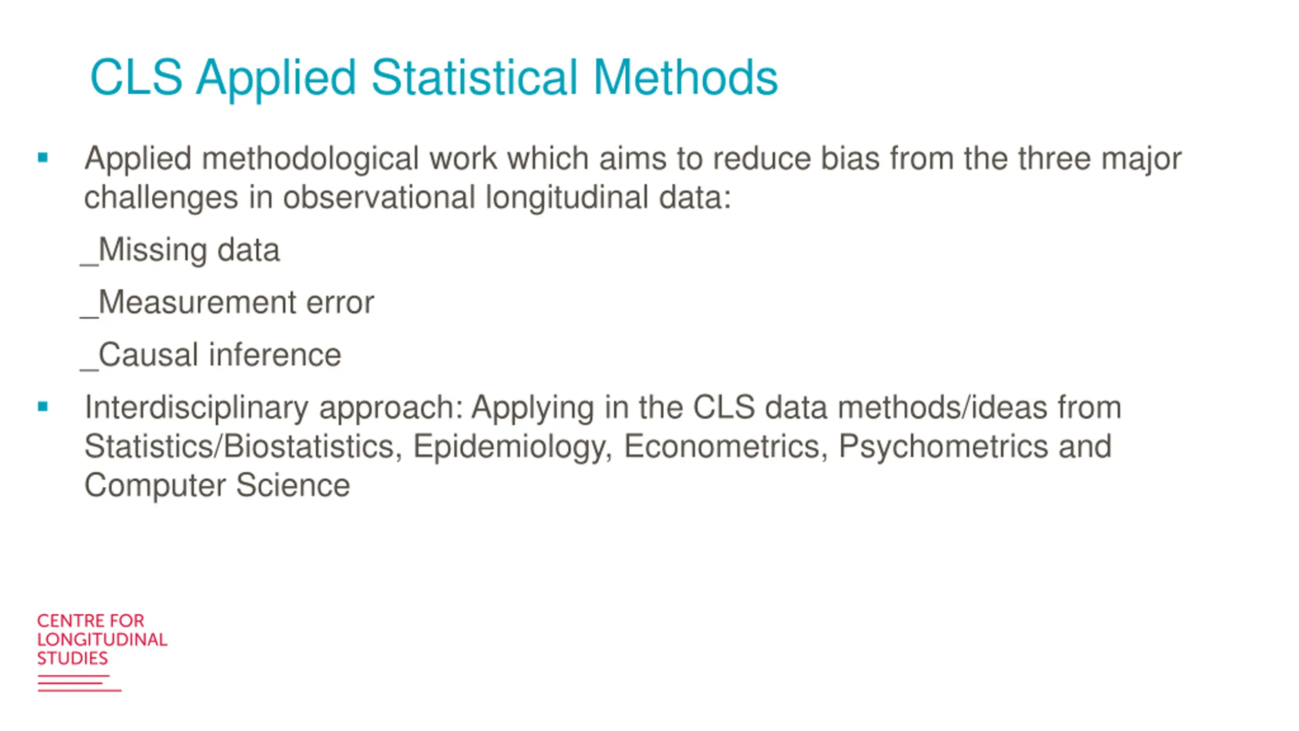 CLS Applied Statistical Methods Applied methodological work which aims to reduce bias from the three major challenges in observational longitudinal data: _Missing data _Measurement error _Causal inference Interdisciplinary approach: Applying in the CLS data methods/ideas from Statistics/Biostatistics, Epidemiology, Econometrics, Psychometrics and Computer Science