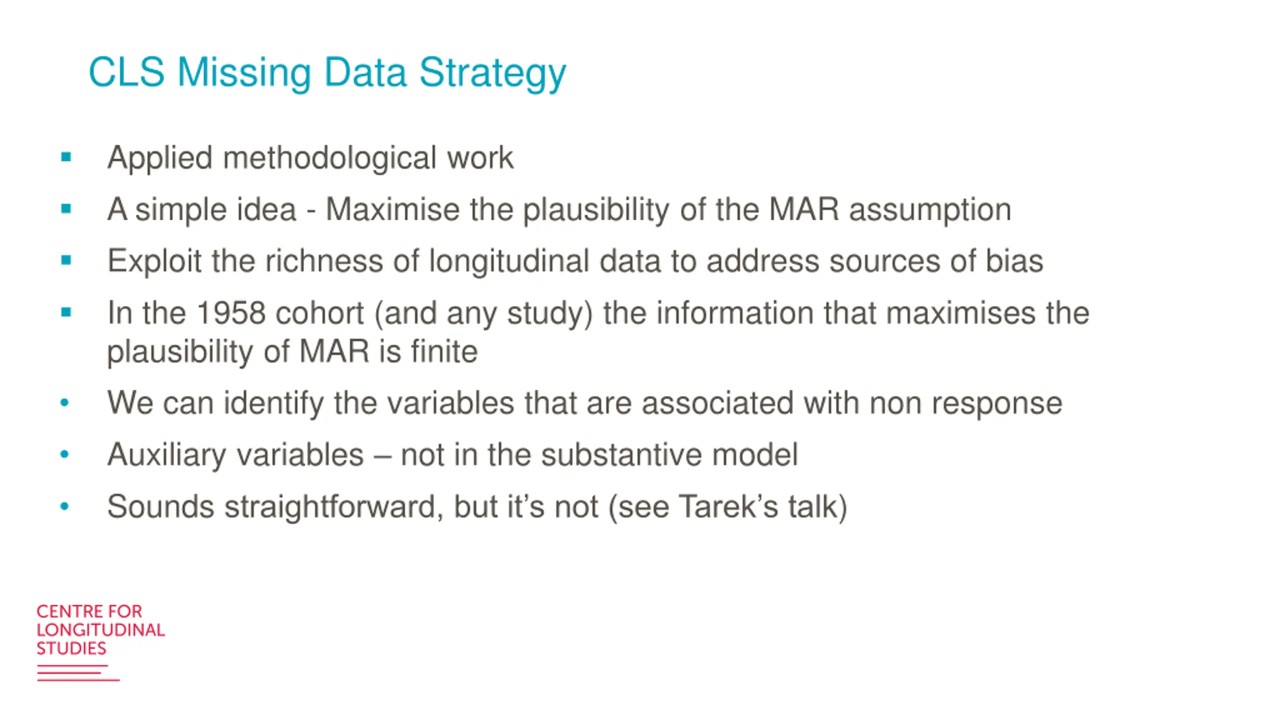 CLS Missing Data Strategy Applied methodological work A simple idea - Maximise the plausibility of the MAR assumption Exploit the richness of longitudinal data to address sources of bias In the 1958 cohort (and any study) the information that maximises the plausibility of MAR is finite We can identify the variables that are associated with non response Auxiliary variables not in the substantive model Sounds straightforward, but it s not (see Tarek s talk)
