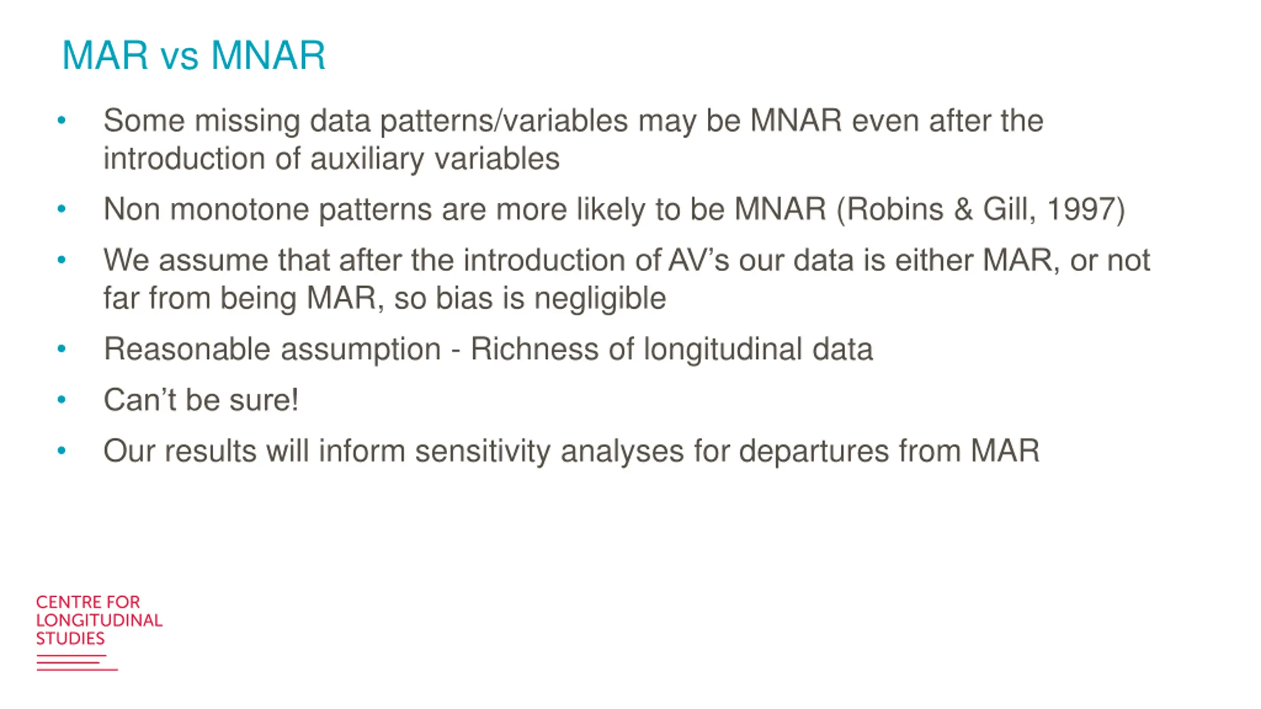 MAR vs MNAR Some missing data patterns/variables may be MNAR even after the introduction of auxiliary variables Non monotone patterns are more likely to be MNAR (Robins & Gill, 1997) We assume that after the introduction of AV s our data is either MAR, or not far from being MAR, so bias is negligible Reasonable assumption - Richness of longitudinal data Can t be sure! Our results will inform sensitivity analyses for departures from MAR