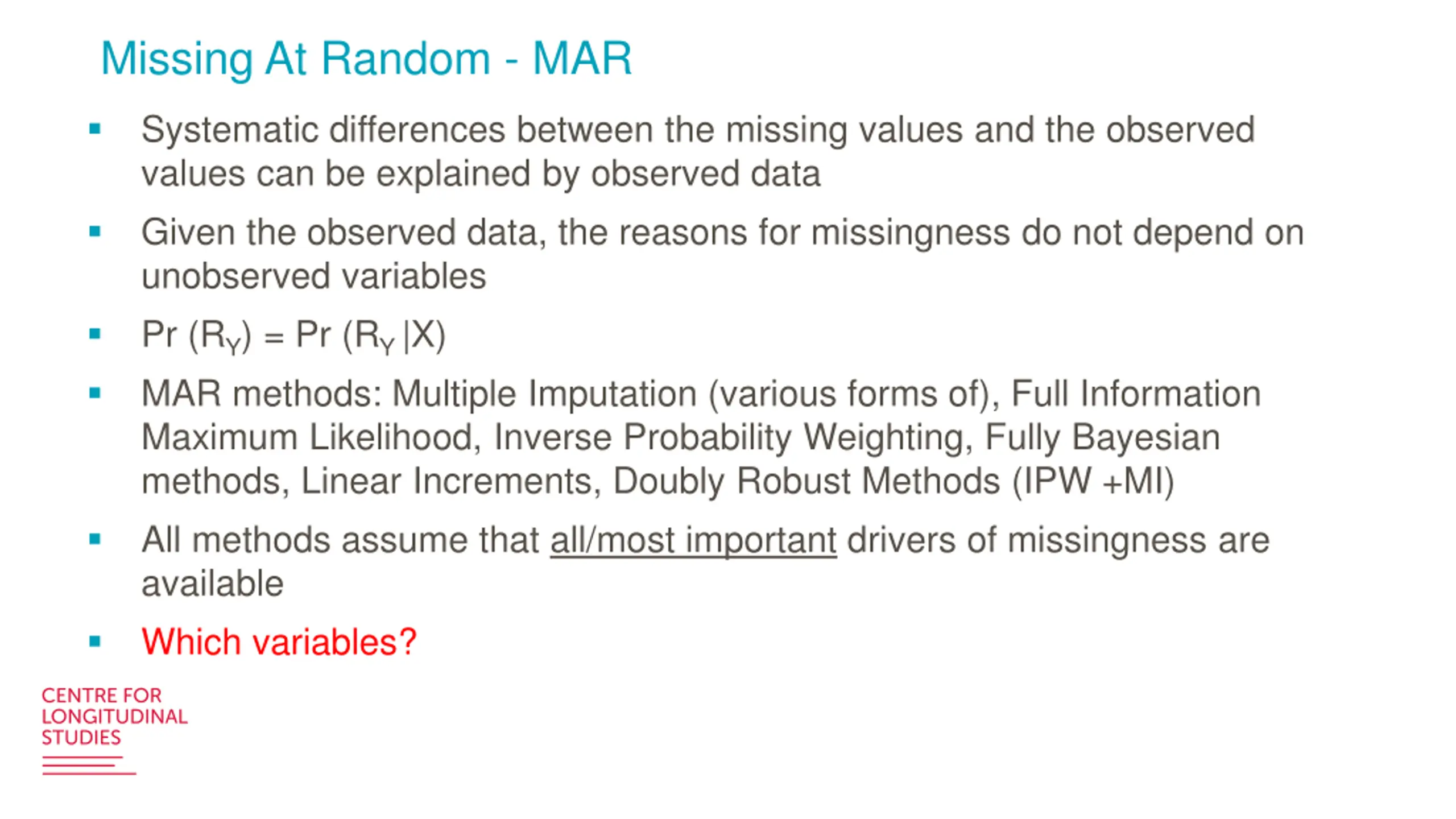 Missing At Random - MAR Systematic differences between the missing values and the observed values can be explained by observed data Given the observed data, the reasons for missingness do not depend on unobserved variables Pr (RY) = Pr (RY|X) MAR methods: Multiple Imputation (various forms of), Full Information Maximum Likelihood, Inverse Probability Weighting, Fully Bayesian methods, Linear Increments, Doubly Robust Methods (IPW +MI) All methods assume that all/most important drivers of missingness are available Which variables?