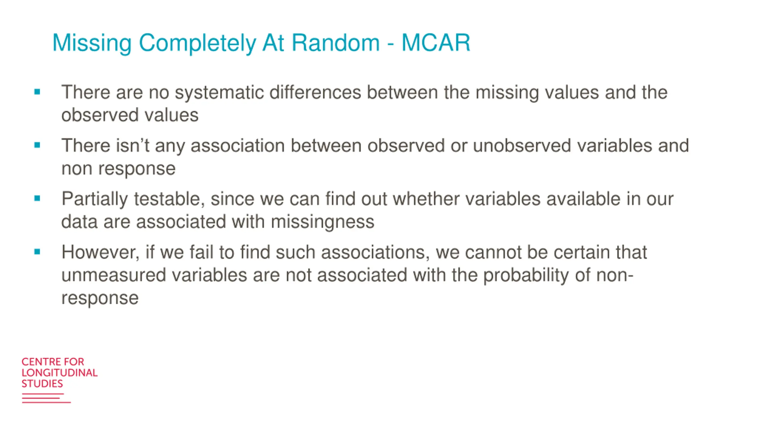 Missing Completely At Random - MCAR There are no systematic differences between the missing values and the observed values There isn t any association between observed or unobserved variables and non response Partially testable, since we can find out whether variables available in our data are associated with missingness However, if we fail to find such associations, we cannot be certain that unmeasured variables are not associated with the probability of non- response