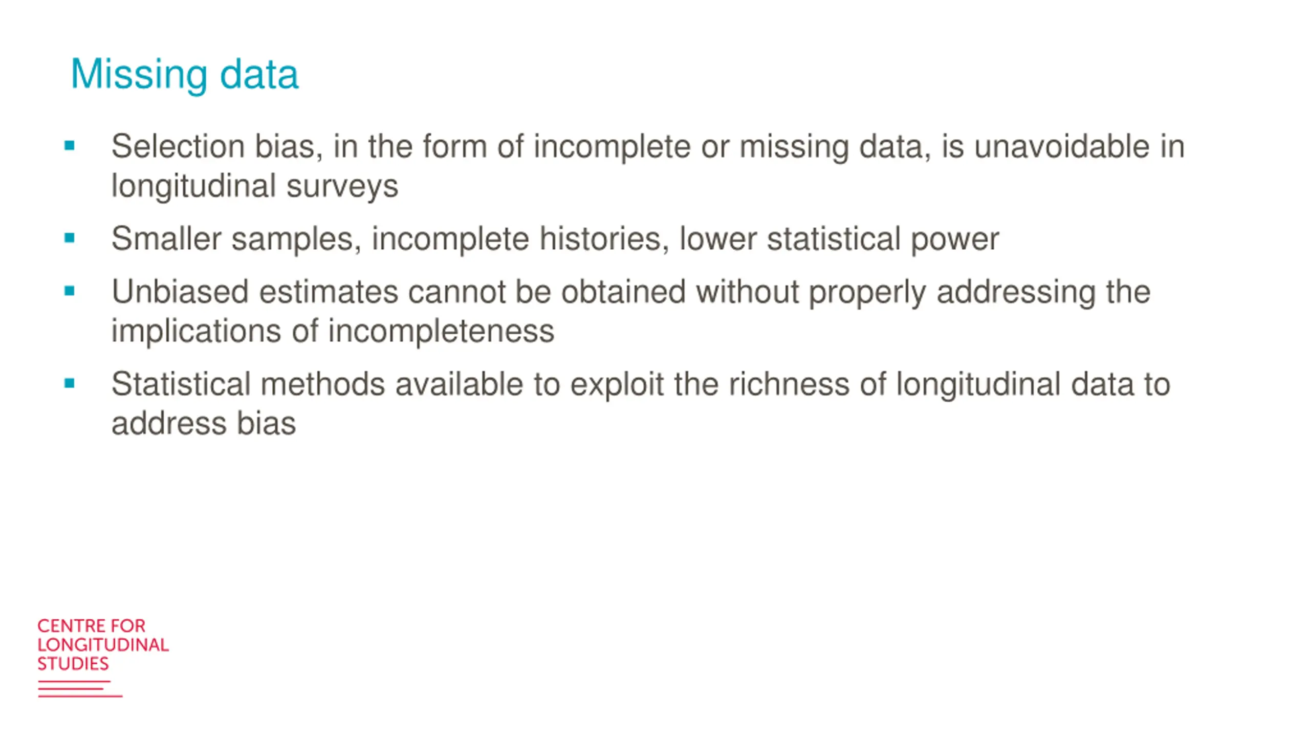 Missing data Selection bias, in the form of incomplete or missing data, is unavoidable in longitudinal surveys Smaller samples, incomplete histories, lower statistical power Unbiased estimates cannot be obtained without properly addressing the implications of incompleteness Statistical methods available to exploit the richness of longitudinal data to address bias