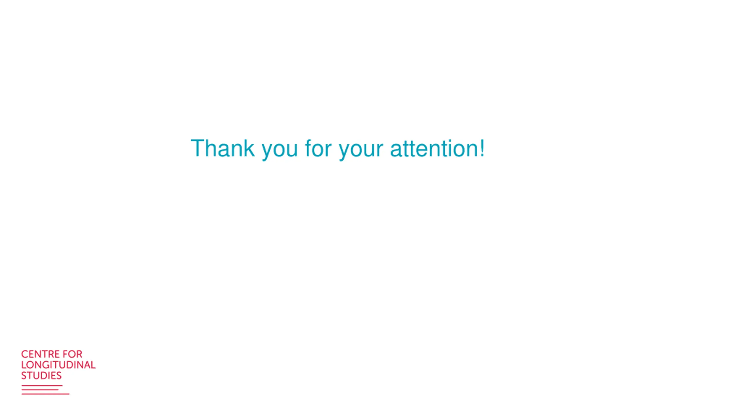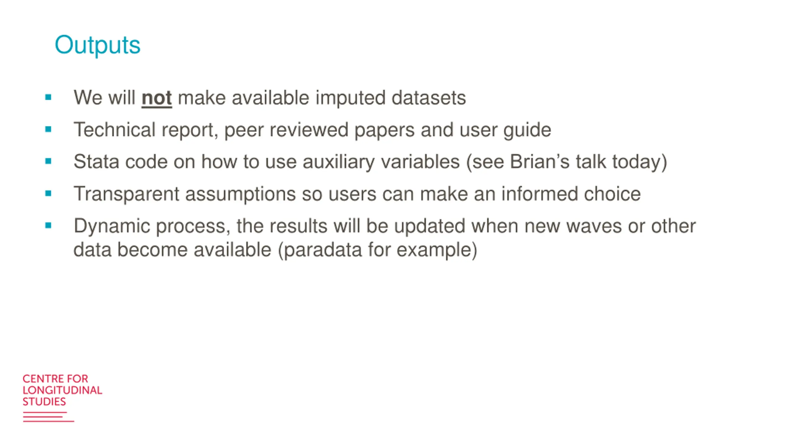 Outputs We will not make available imputed datasets Technical report, peer reviewed papers and user guide Stata code on how to use auxiliary variables (see Brian s talk today) Transparent assumptions so users can make an informed choice Dynamic process, the results will be updated when new waves or other data become available (paradata for example)