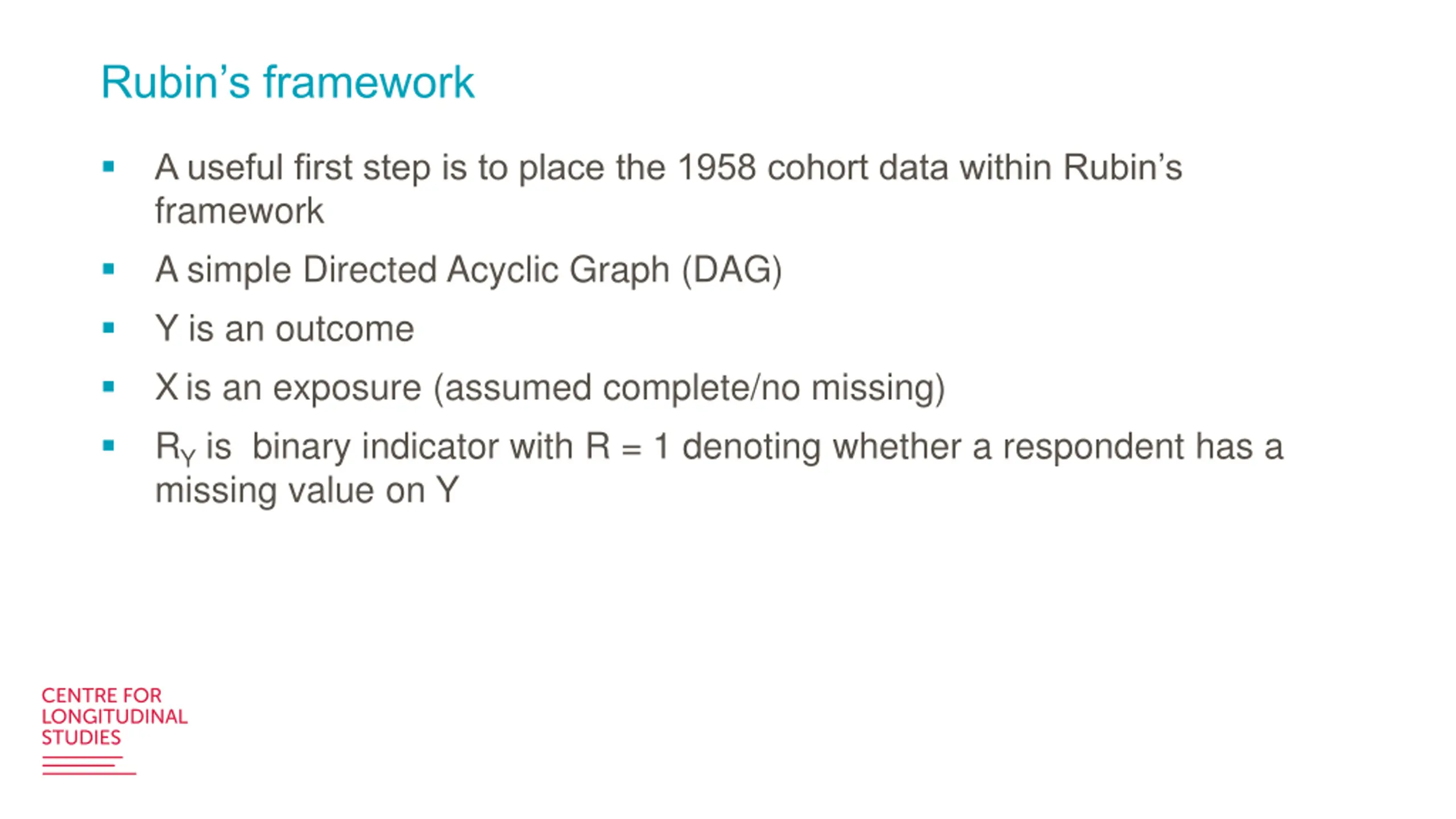 Rubins framework A useful first step is to place the 1958 cohort data within Rubin s framework A simple Directed Acyclic Graph (DAG) Y is an outcome Xis an exposure (assumed complete/no missing) RYis binary indicator with R = 1 denoting whether a respondent has a missing value on Y