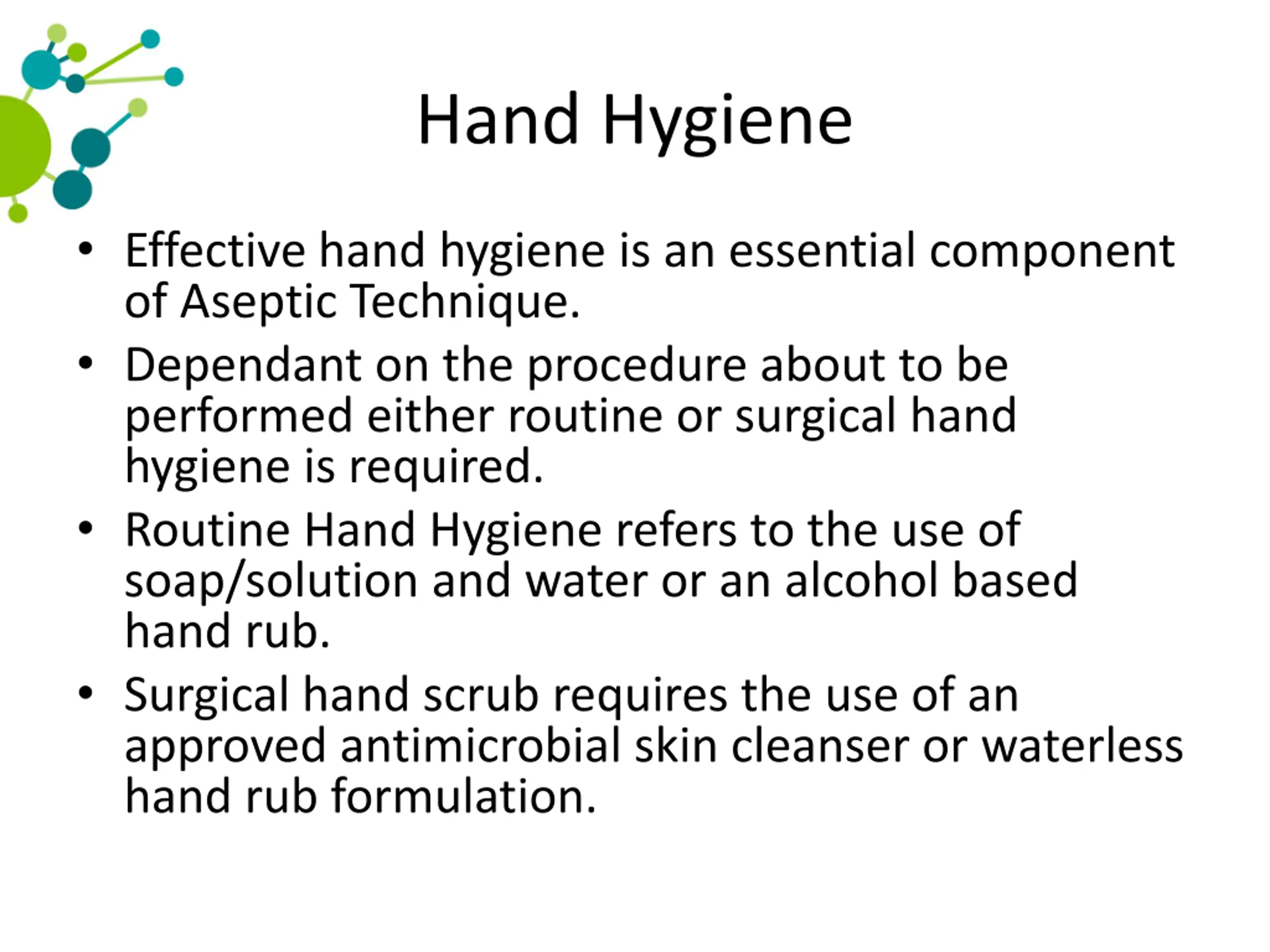 Hand Hygiene Effective hand hygiene is an essential component of Aseptic Technique. Dependant on the procedure about to be performed either routine or surgical hand hygiene is required. Routine Hand Hygiene refers to the use of soap/solution and water or an alcohol based hand rub. Surgical hand scrub requires the use of an approved antimicrobial skin cleanser or waterless hand rub formulation.