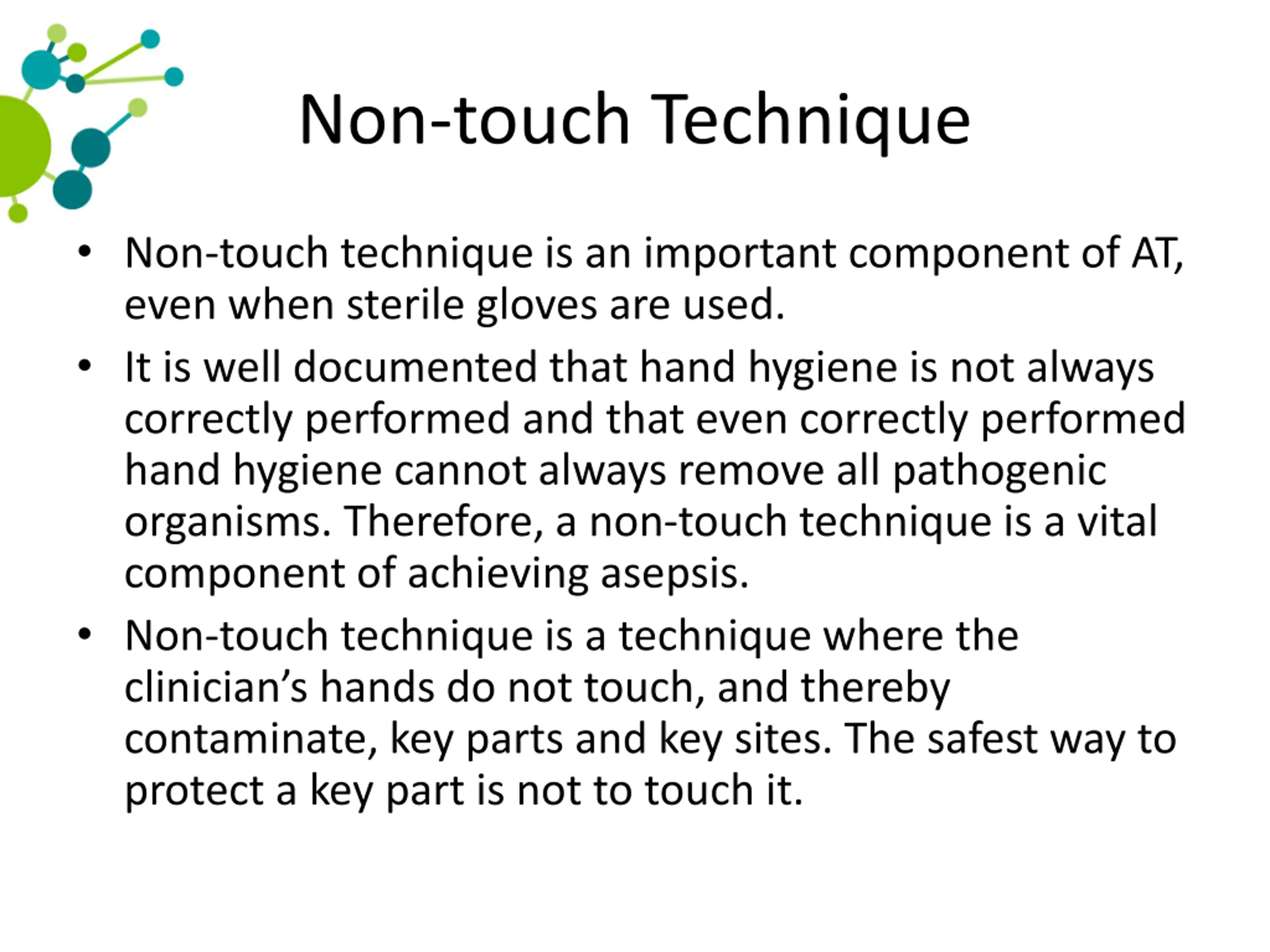 Non-touch Technique Non-touch technique is an important component of AT, even when sterile gloves are used. It is well documented that hand hygiene is not always correctly performed and that even correctly performed hand hygiene cannot always remove all pathogenic organisms. Therefore, a non-touch technique is a vital component of achieving asepsis. Non-touch technique is a technique where the clinician s hands do not touch, and thereby contaminate, key parts and key sites. The safest way to protect a key part is not to touch it.