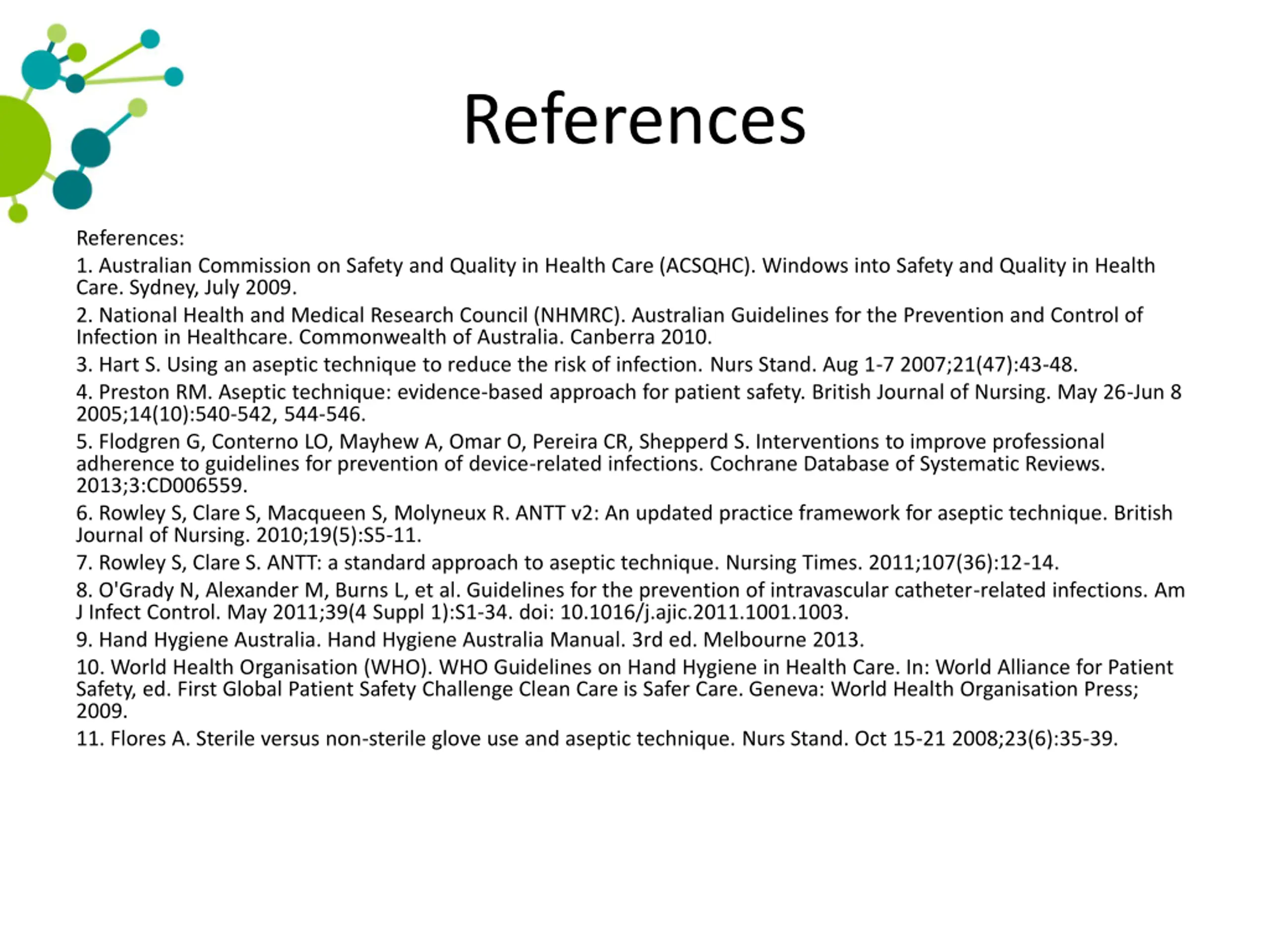 References References: 1. Australian Commission on Safety and Quality in Health Care (ACSQHC). Windows into Safety and Quality in Health Care. Sydney, July 2009. 2. National Health and Medical Research Council (NHMRC). Australian Guidelines for the Prevention and Control of Infection in Healthcare. Commonwealth of Australia. Canberra 2010. 3. Hart S. Using an aseptic technique to reduce the risk of infection. Nurs Stand. Aug 1-7 2007;21(47):43-48. 4. Preston RM. Aseptic technique: evidence-based approach for patient safety. British Journal of Nursing. May 26-Jun 8 2005;14(10):540-542, 544-546. 5. Flodgren G, Conterno LO, Mayhew A, Omar O, Pereira CR, Shepperd S. Interventions to improve professional adherence to guidelines for prevention of device-related infections. Cochrane Database of Systematic Reviews. 2013;3:CD006559. 6. Rowley S, Clare S, Macqueen S, Molyneux R. ANTT v2: An updated practice framework for aseptic technique. British Journal of Nursing. 2010;19(5):S5-11. 7. Rowley S, Clare S. ANTT: a standard approach to aseptic technique. Nursing Times. 2011;107(36):12-14. 8. O'Grady N, Alexander M, Burns L, et al. Guidelines for the prevention of intravascular catheter-related infections. Am J Infect Control. May 2011;39(4 Suppl 1):S1-34. doi: 10.1016/j.ajic.2011.1001.1003. 9. Hand Hygiene Australia. Hand Hygiene Australia Manual. 3rd ed. Melbourne 2013. 10. World Health Organisation (WHO). WHO Guidelines on Hand Hygiene in Health Care. In: World Alliance for Patient Safety, ed. First Global Patient Safety Challenge Clean Care is Safer Care. Geneva: World Health Organisation Press; 2009. 11. Flores A. Sterile versus non-sterile glove use and aseptic technique. Nurs Stand. Oct 15-21 2008;23(6):35-39.