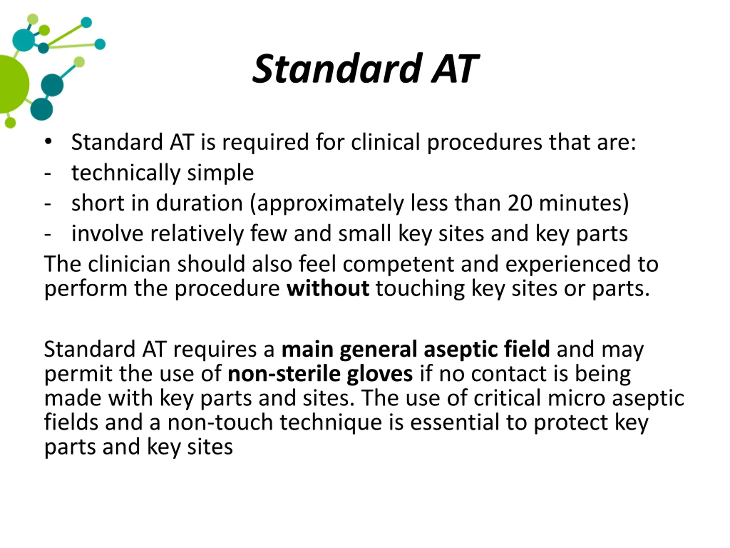 Standard AT Standard AT is required for clinical procedures that are: - technically simple - short in duration (approximately less than 20 minutes) - involve relatively few and small key sites and key parts The clinician should also feel competent and experienced to perform the procedure without touching key sites or parts. Standard AT requires a main general aseptic field and may permit the use of non-sterile gloves if no contact is being made with key parts and sites. The use of critical micro aseptic fields and a non-touch technique is essential to protect key parts and key sites