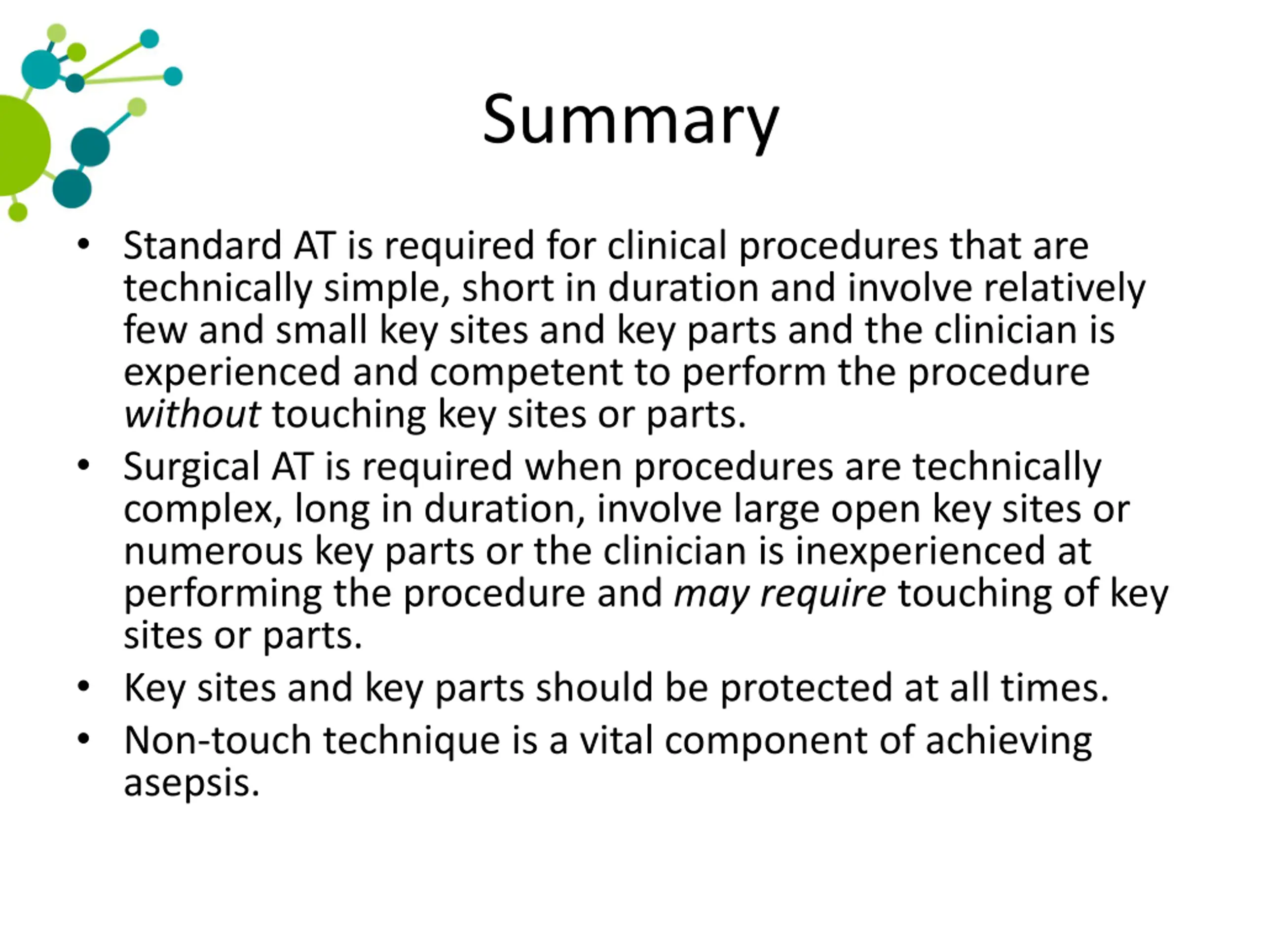 Summary Standard AT is required for clinical procedures that are technically simple, short in duration and involve relatively few and small key sites and key parts and the clinician is experienced and competent to perform the procedure without touching key sites or parts. Surgical AT is required when procedures are technically complex, long in duration, involve large open key sites or numerous key parts or the clinician is inexperienced at performing the procedure and may require touching of key sites or parts. Key sites and key parts should be protected at all times. Non-touch technique is a vital component of achieving asepsis.