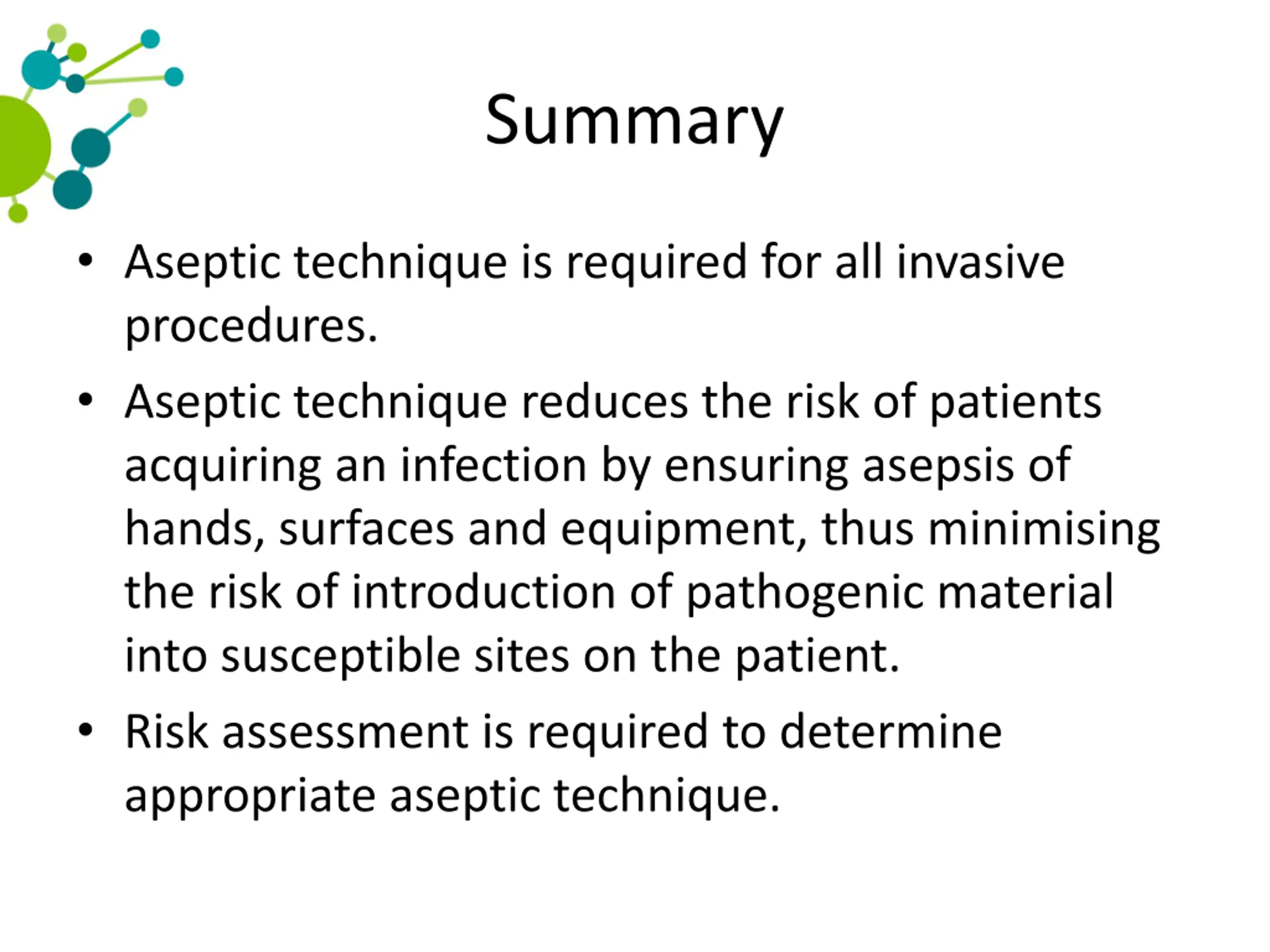 Summary Aseptic technique is required for all invasive procedures. Aseptic technique reduces the risk of patients acquiring an infection by ensuring asepsis of hands, surfaces and equipment, thus minimising the risk of introduction of pathogenic material into susceptible sites on the patient. Risk assessment is required to determine appropriate aseptic technique.