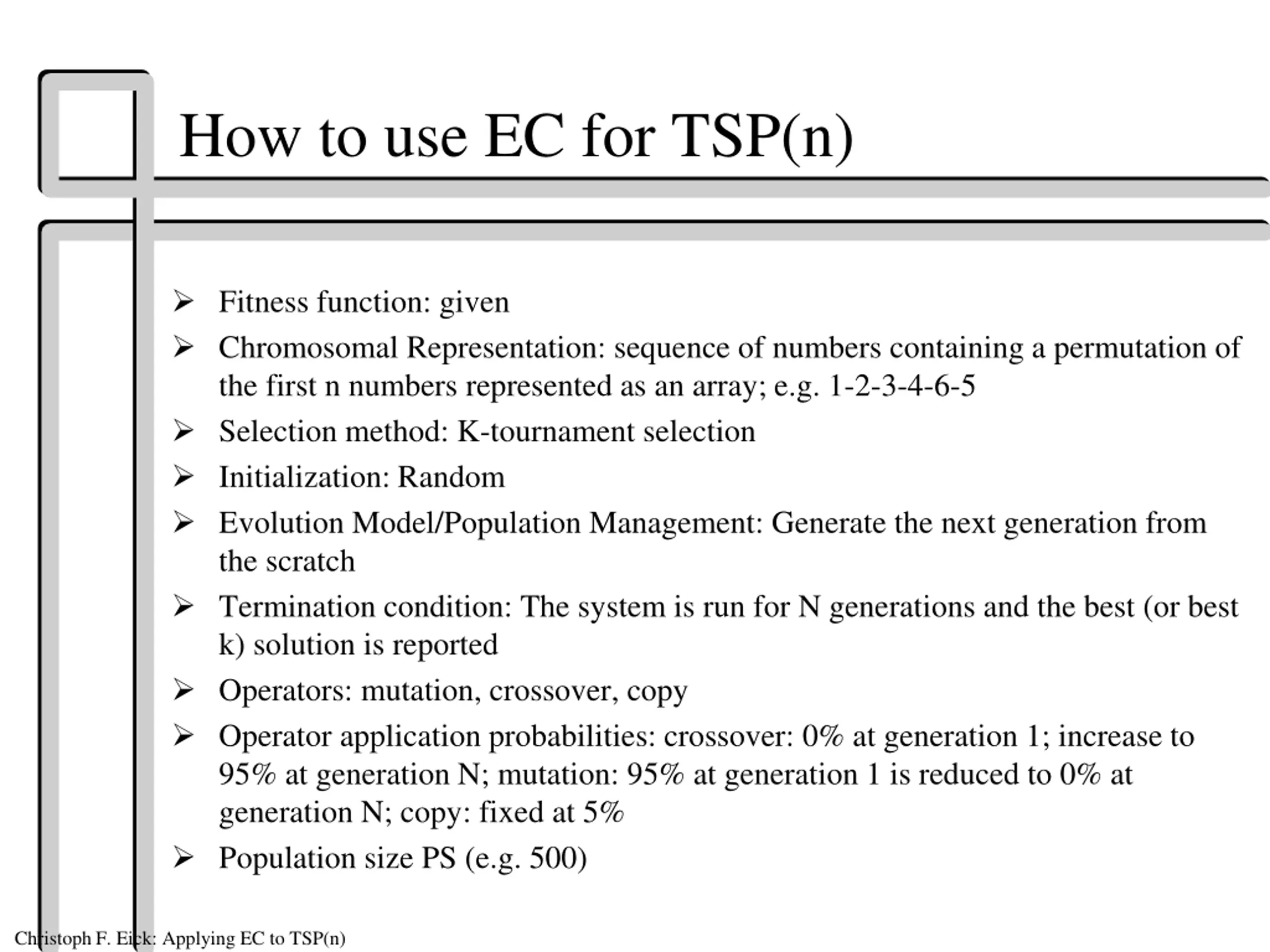 How to use EC for TSP(n) Fitness function: given Chromosomal Representation: sequence of numbers containing a permutation of the first n numbers represented as an array; e.g. 1-2-3-4-6-5 Selection method: K-tournament selection Initialization: Random Evolution Model/Population Management: Generate the next generation from the scratch Termination condition: The system is run for N generations and the best (or best k) solution is reported Operators: mutation, crossover, copy Operator application probabilities: crossover: 0% at generation 1; increase to 95% at generation N; mutation: 95% at generation 1 is reduced to 0% at generation N; copy: fixed at 5% Population size PS (e.g. 500) Christoph F. Eick: Applying EC to TSP(n)