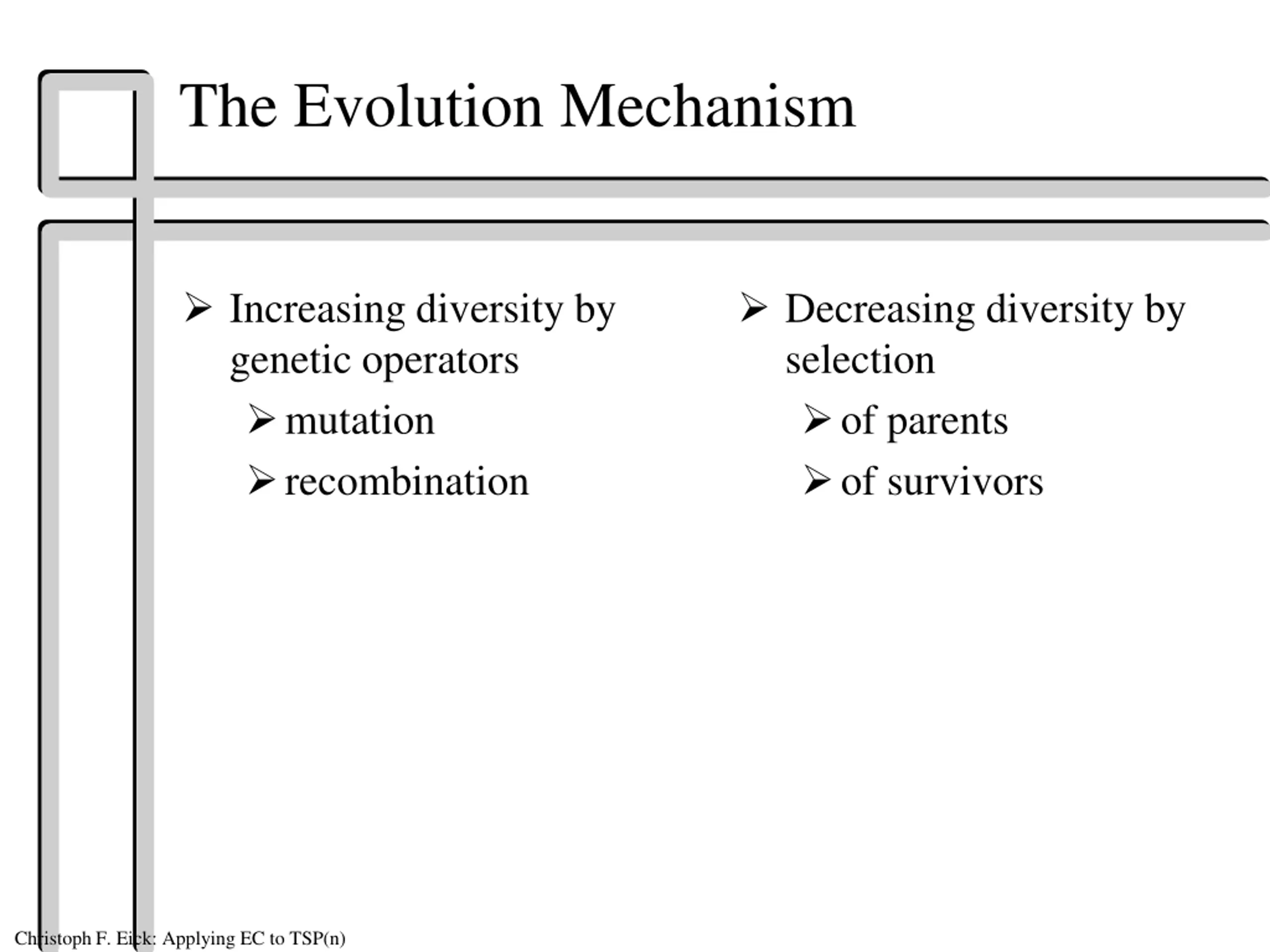 The Evolution Mechanism Increasing diversity by genetic operators mutation recombination Decreasing diversity by selection of parents of survivors Christoph F. Eick: Applying EC to TSP(n)