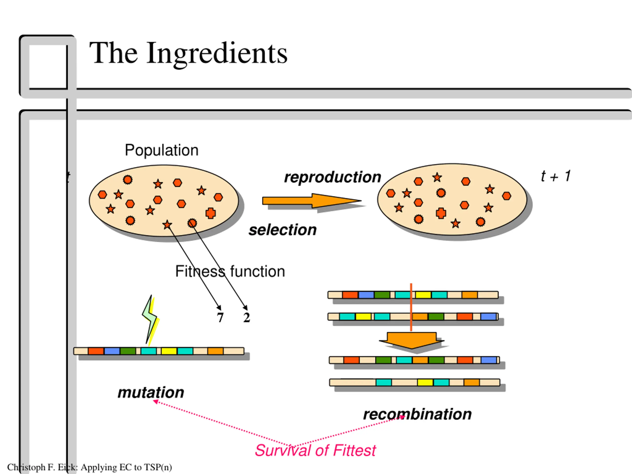 The Ingredients Population t + 1 t reproduction selection Fitness function 7 2 mutation recombination Survival of Fittest Christoph F. Eick: Applying EC to TSP(n)