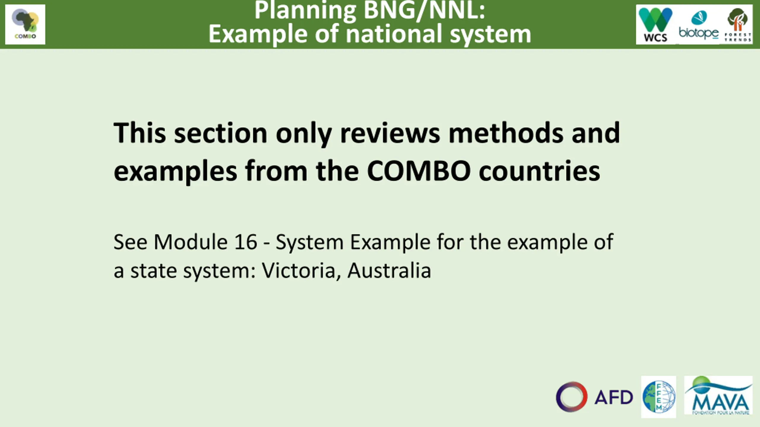 Planning BNG/NNL: Example of national system This section only reviews methods and examples from the COMBO countries See Module 16 - System Example for the example of a state system: Victoria, Australia 2