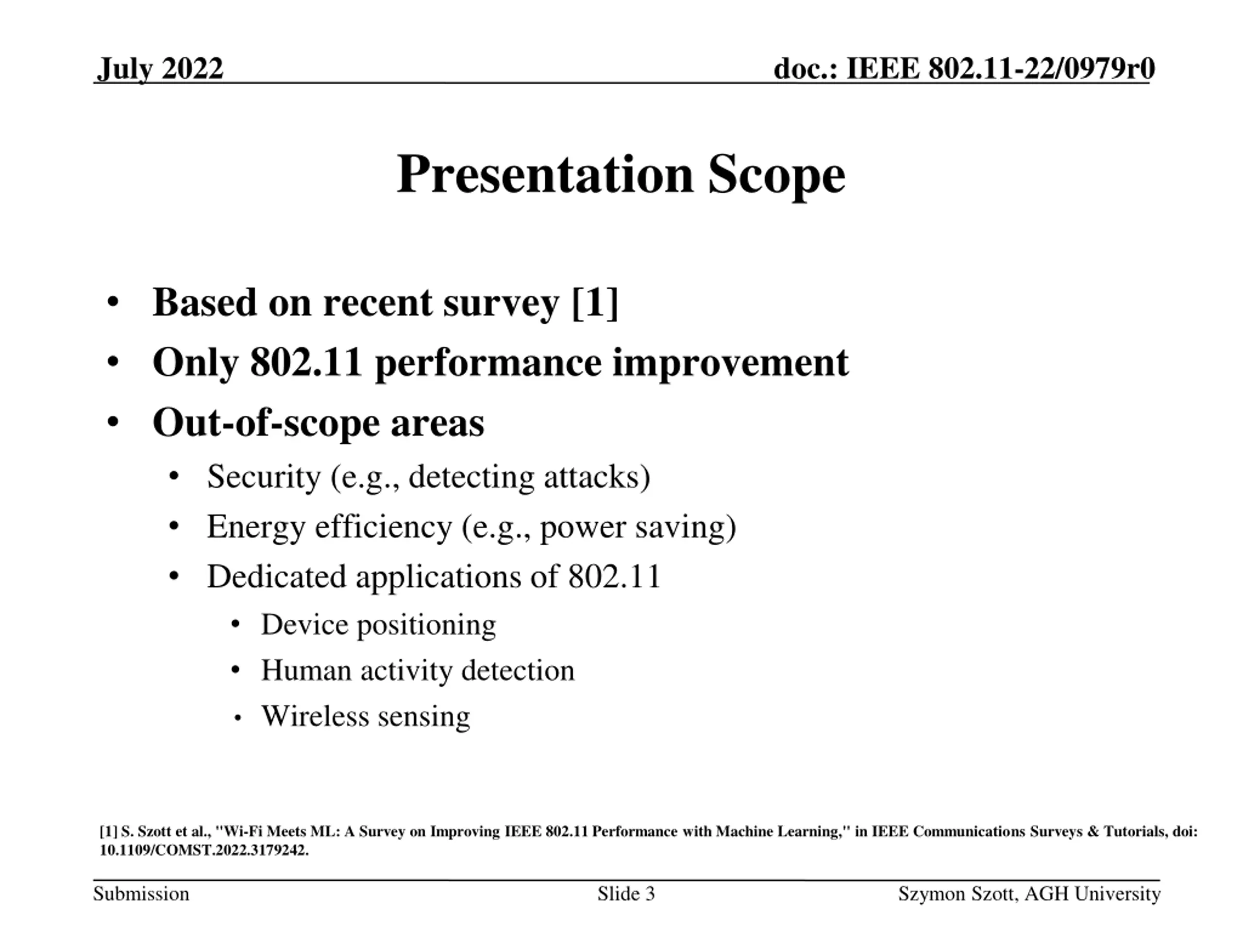 July 2022 doc.: IEEE 802.11-22/0979r0 Presentation Scope Based on recent survey [1] Only 802.11 performance improvement Out-of-scope areas Security (e.g., detecting attacks) Energy efficiency (e.g., power saving) Dedicated applications of 802.11 Device positioning Human activity detection Wireless sensing [1] S. Szott et al., "Wi-Fi Meets ML: A Survey on Improving IEEE 802.11 Performance with Machine Learning," in IEEE Communications Surveys & Tutorials, doi: 10.1109/COMST.2022.3179242. Submission Slide 3 Szymon Szott, AGH University