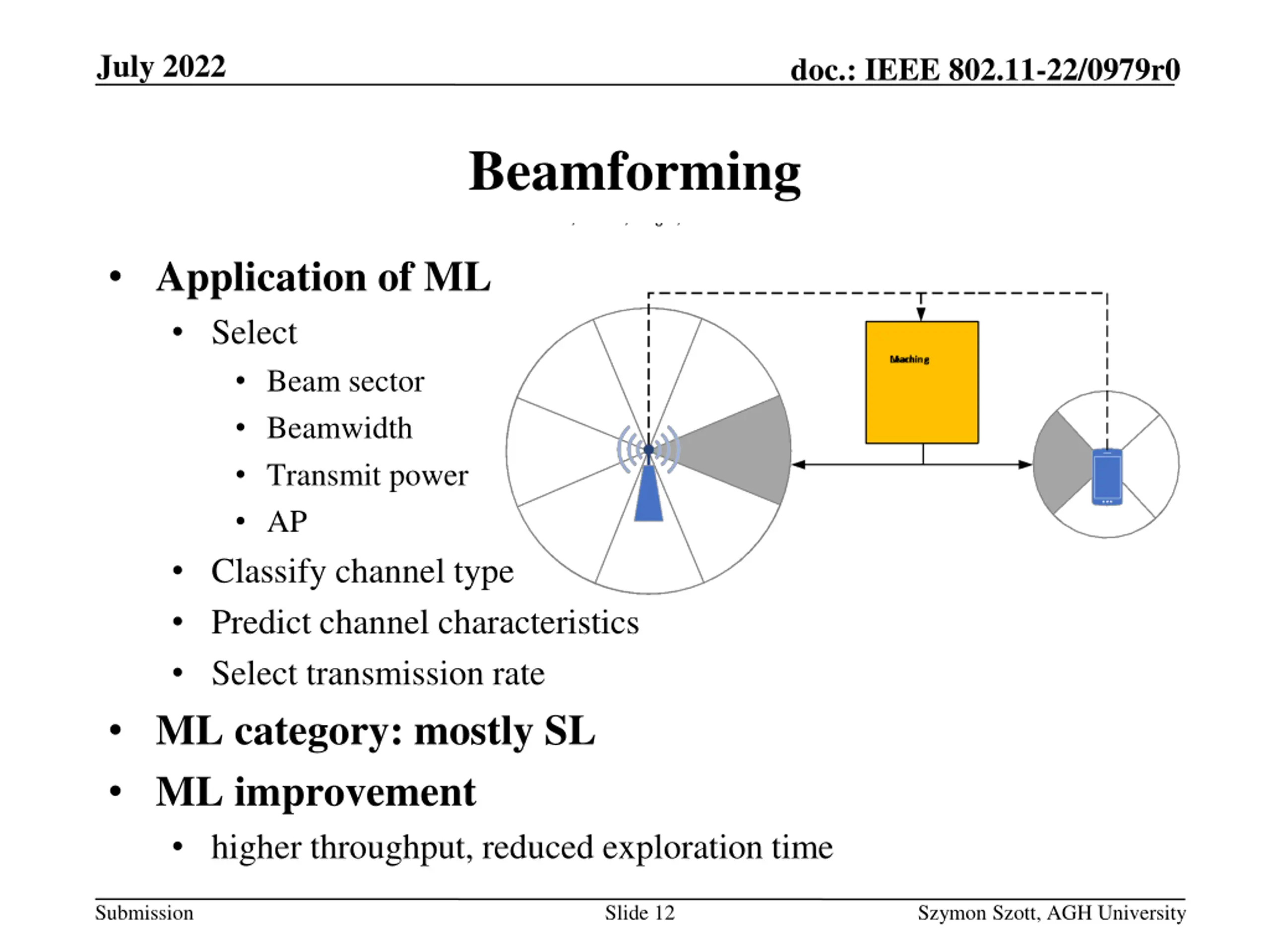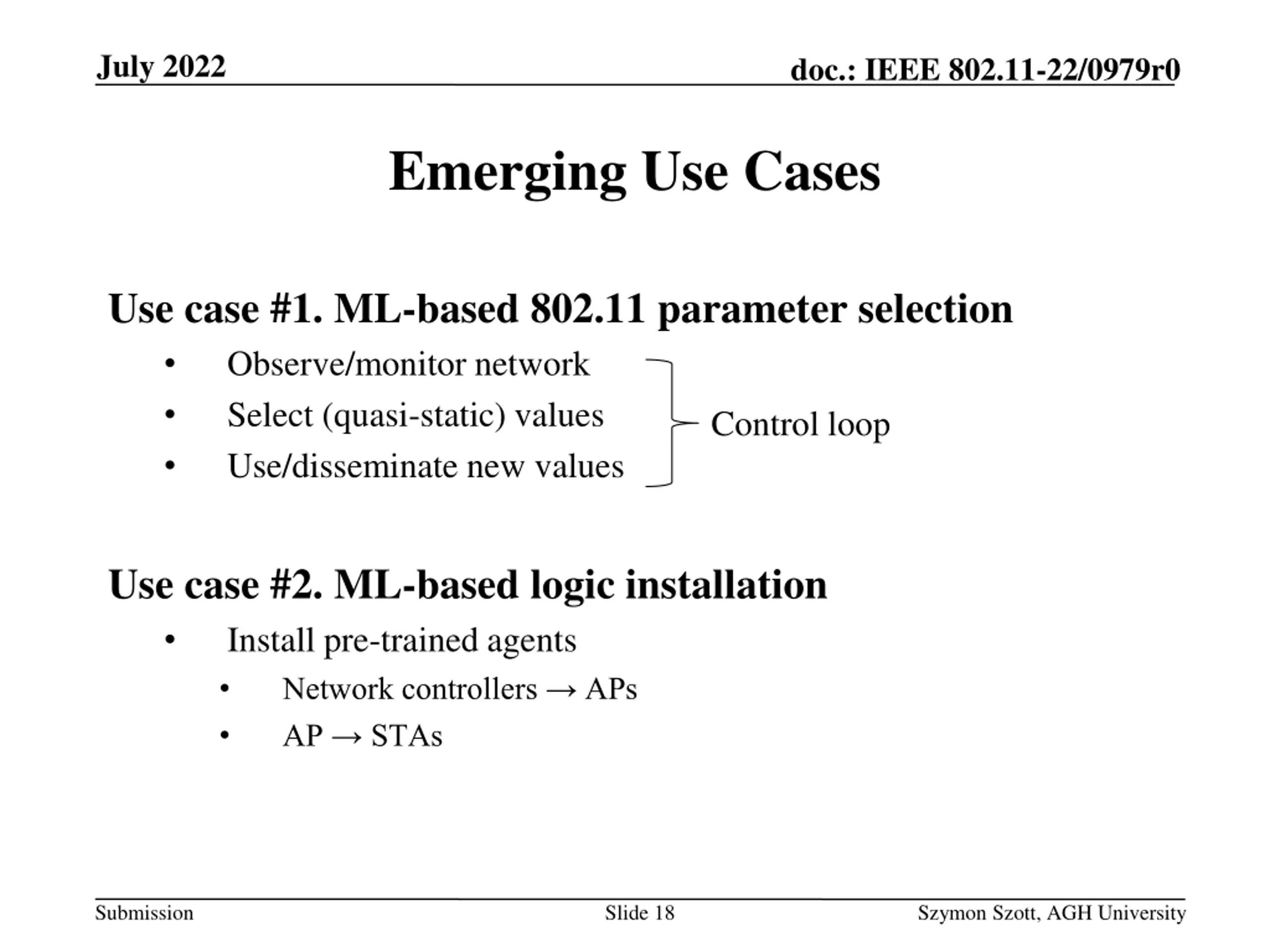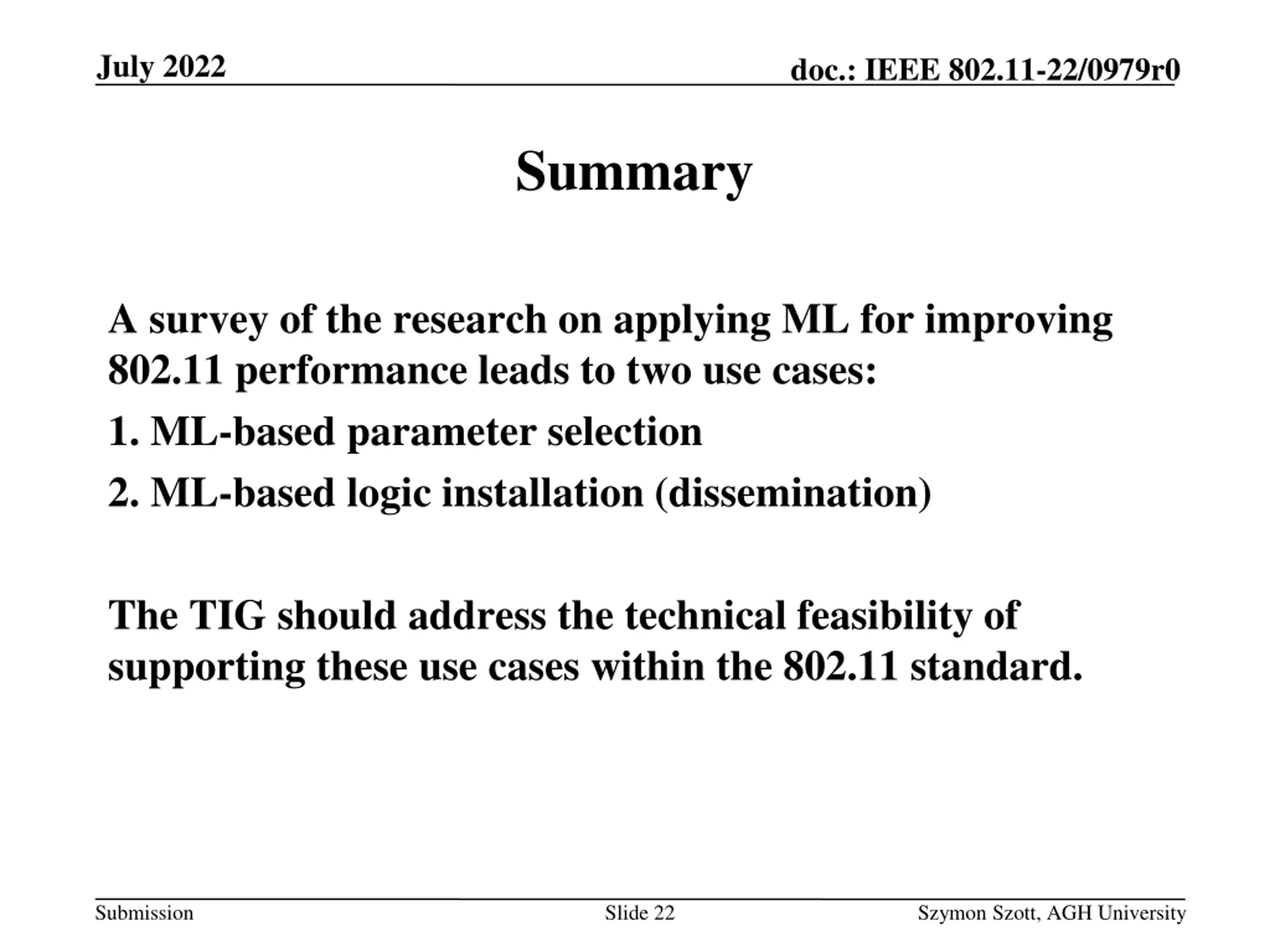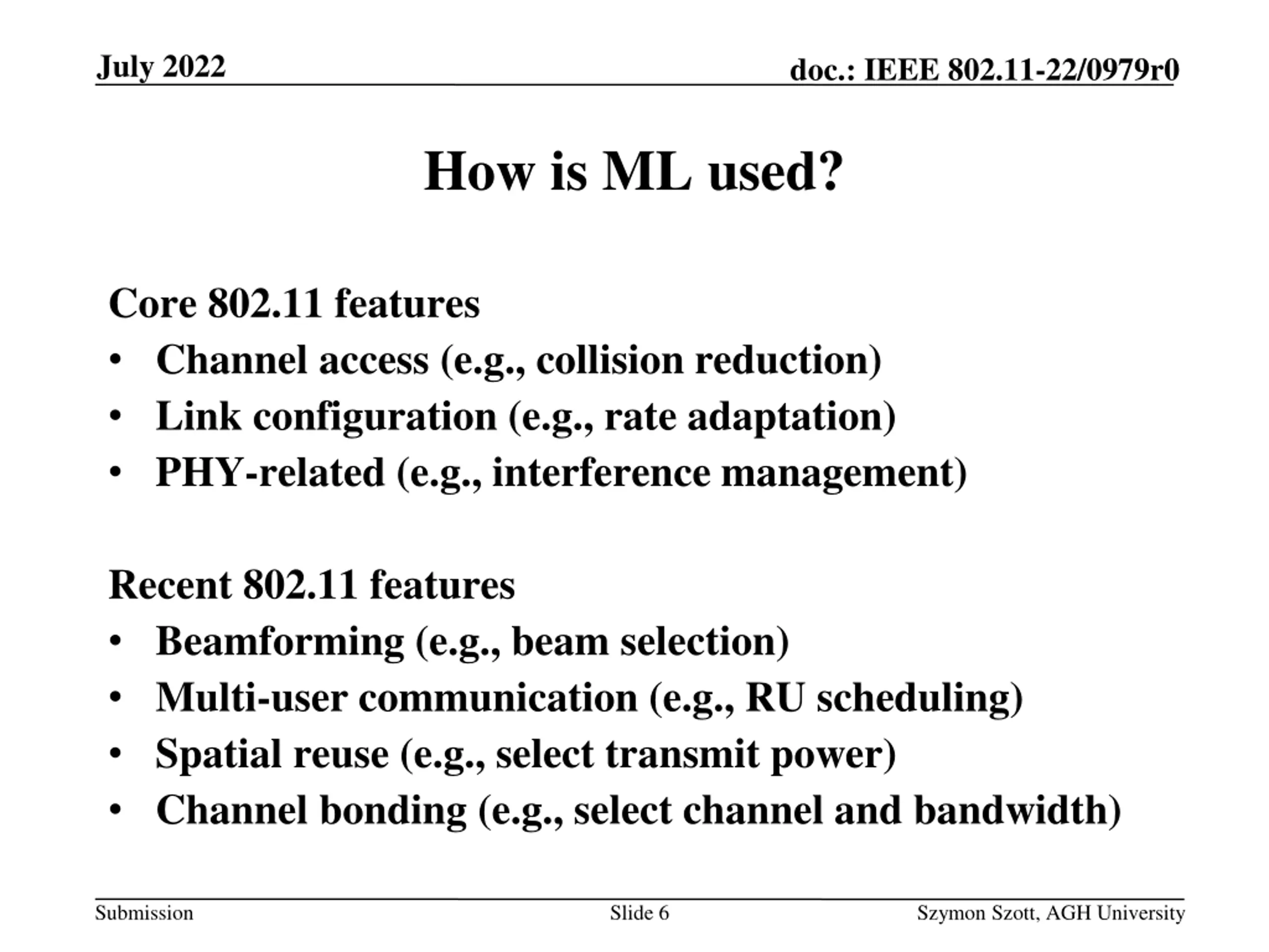 July 2022 Applying ML to 802.11: Current Research and Emerging Use Cases Date: 2022-07-13 Authors: doc.: IEEE 802.11-22/0979r0 Submission Slide 1 Szymon Szott, AGH University