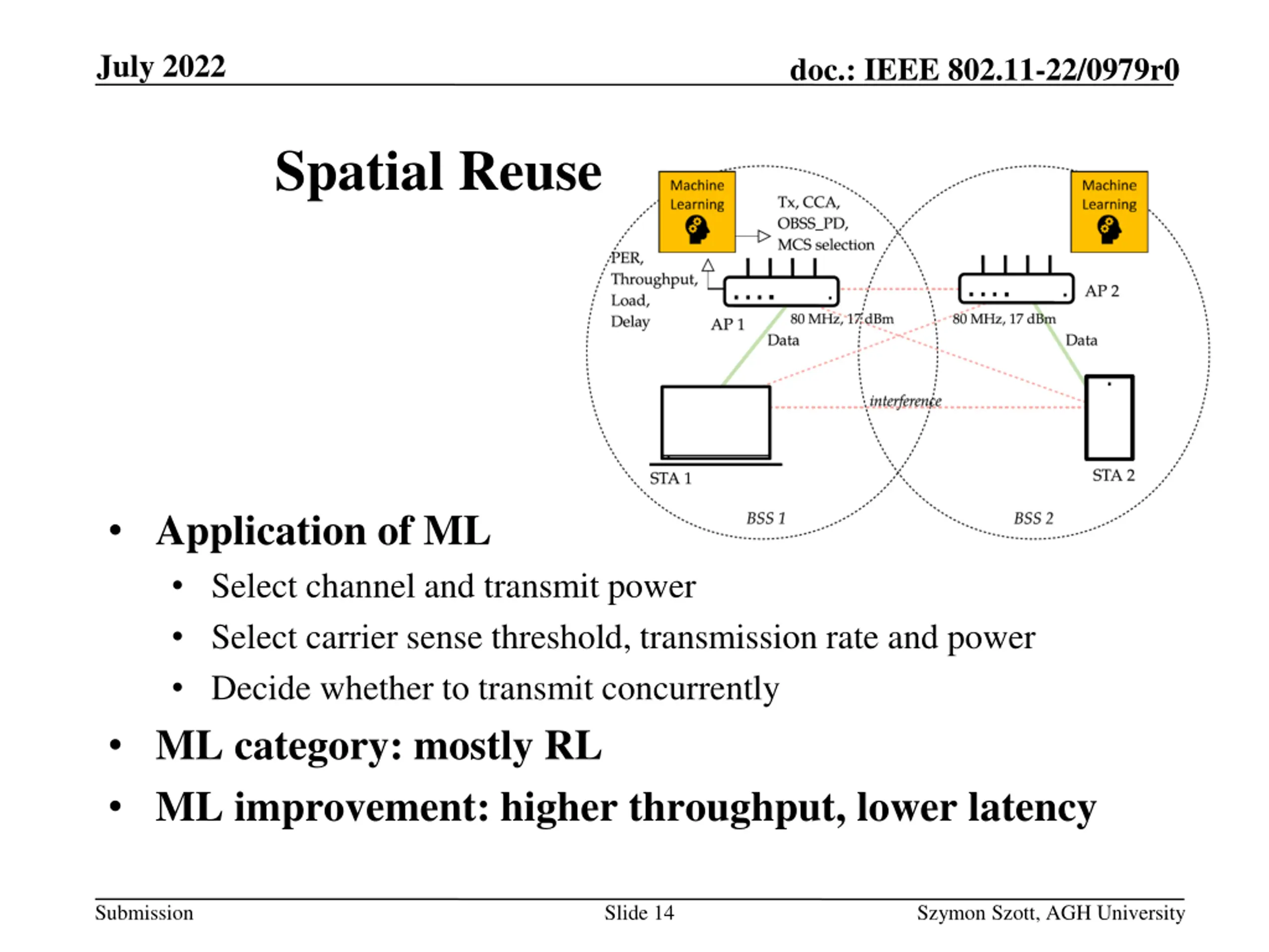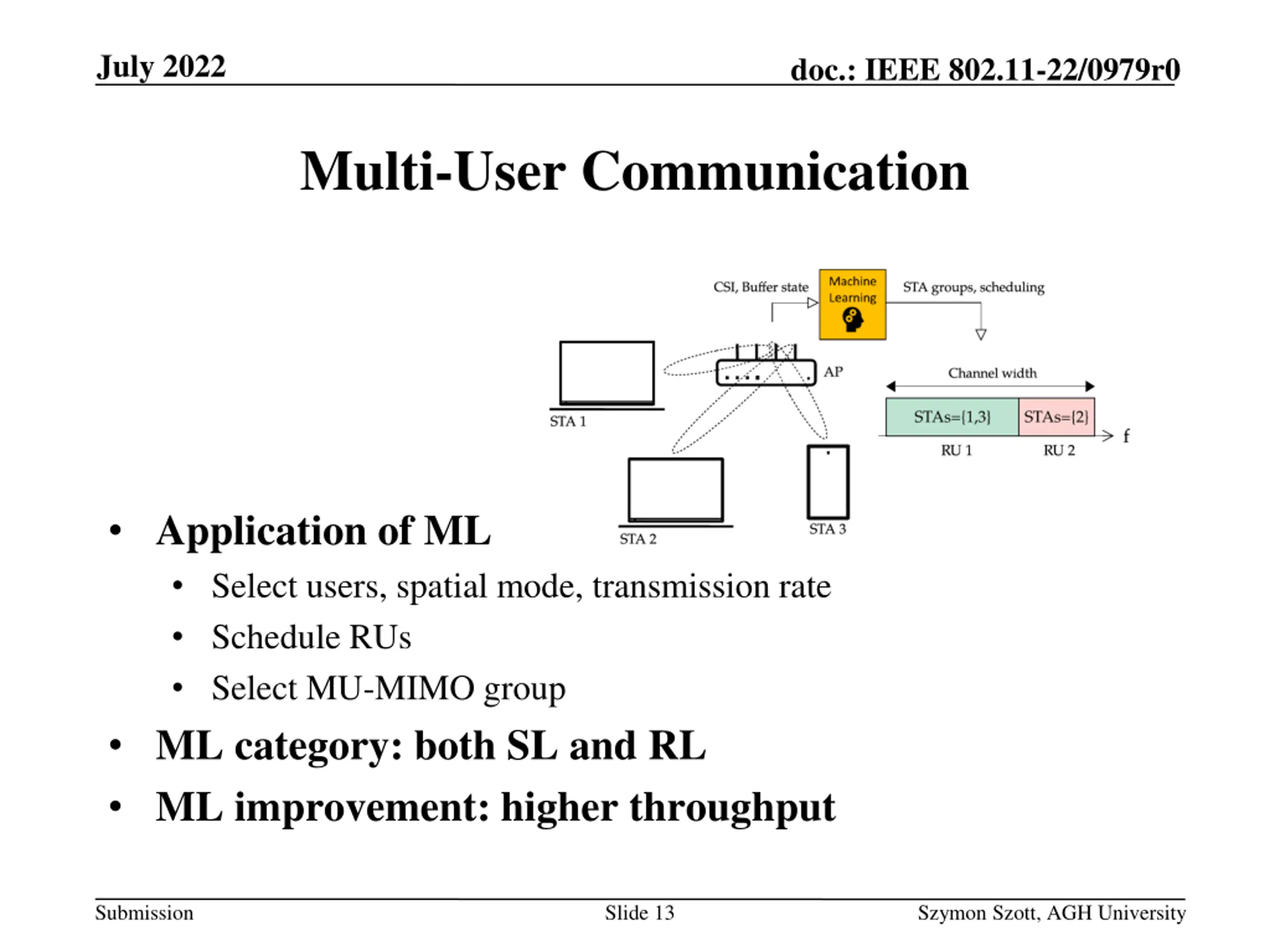 July 2022 doc.: IEEE 802.11-22/0979r0 Multi-User Communication Application of ML Select users, spatial mode, transmission rate Schedule RUs Select MU-MIMO group ML category: both SL and RL ML improvement: higher throughput Submission Slide 13 Szymon Szott, AGH University