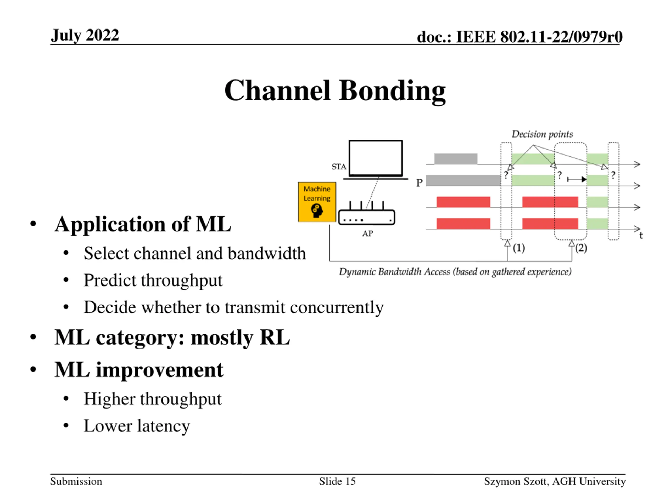 July 2022 doc.: IEEE 802.11-22/0979r0 Spatial Reuse Application of ML Select channel and transmit power Select carrier sense threshold, transmission rate and power Decide whether to transmit concurrently ML category: mostly RL ML improvement: higher throughput, lower latency Submission Slide 14 Szymon Szott, AGH University