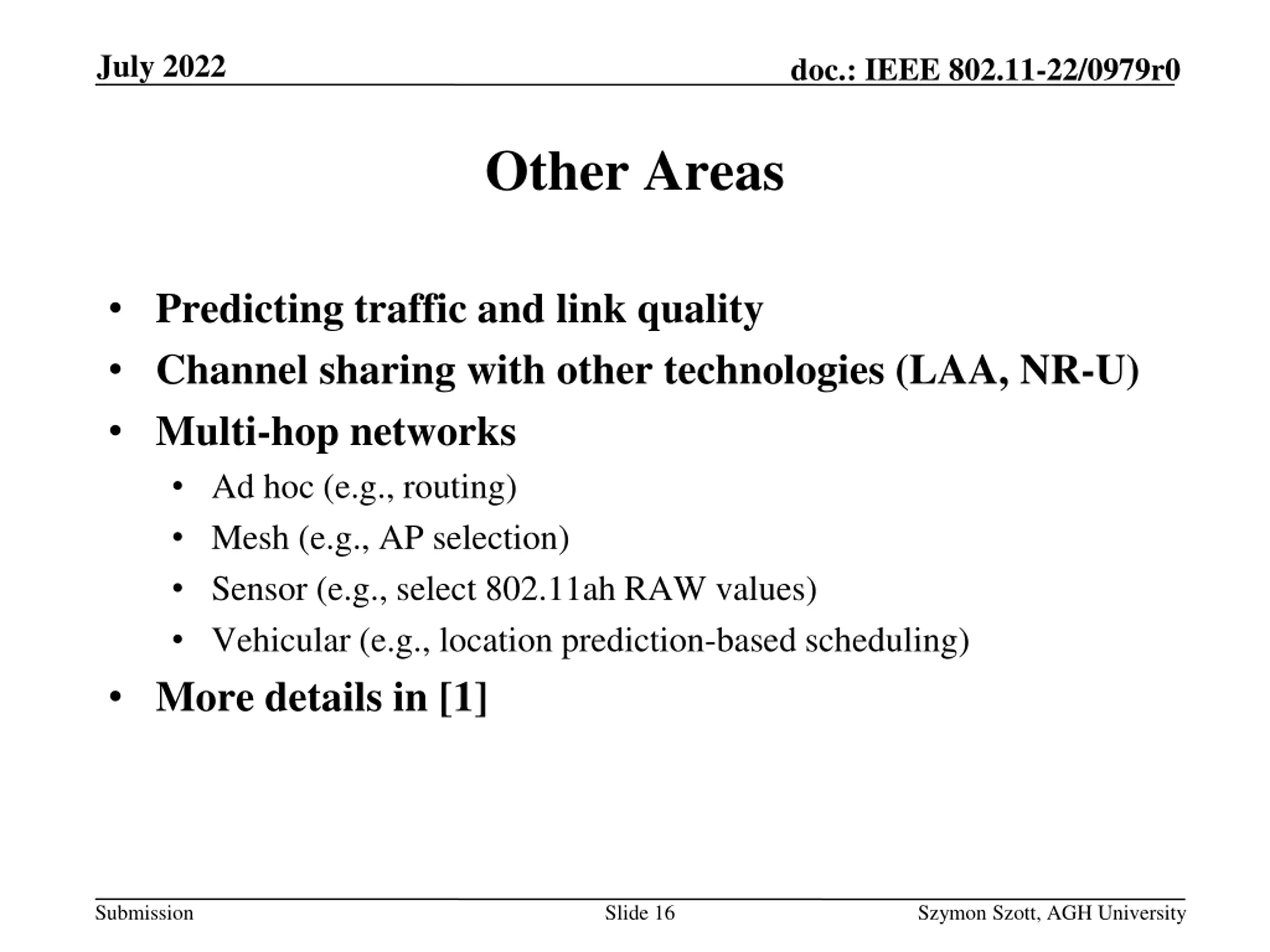 July 2022 doc.: IEEE 802.11-22/0979r0 Channel Bonding Application of ML Select channel and bandwidth Predict throughput Decide whether to transmit concurrently ML category: mostly RL ML improvement Higher throughput Lower latency Submission Slide 15 Szymon Szott, AGH University