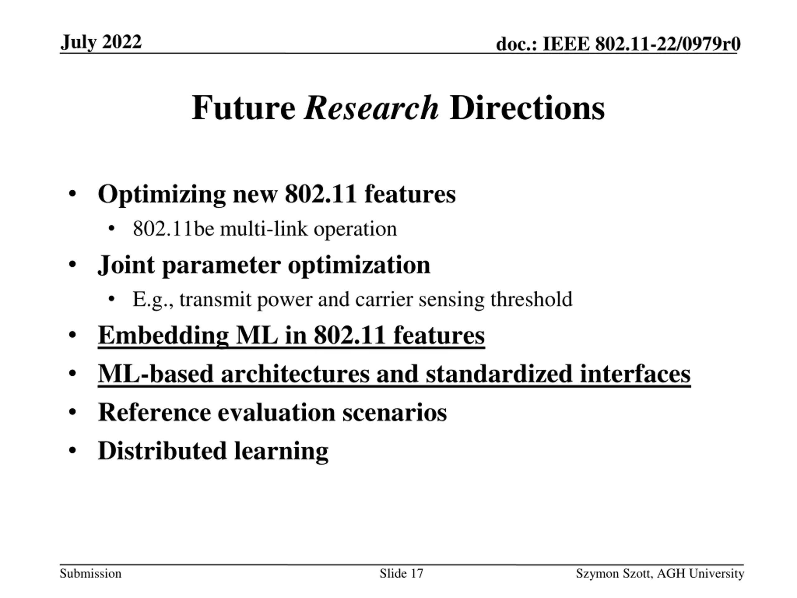 July 2022 doc.: IEEE 802.11-22/0979r0 Future Research Directions Optimizing new 802.11 features 802.11be multi-link operation Joint parameter optimization E.g., transmit power and carrier sensing threshold Embedding ML in 802.11 features ML-based architectures and standardized interfaces Reference evaluation scenarios Distributed learning Submission Slide 17 Szymon Szott, AGH University
