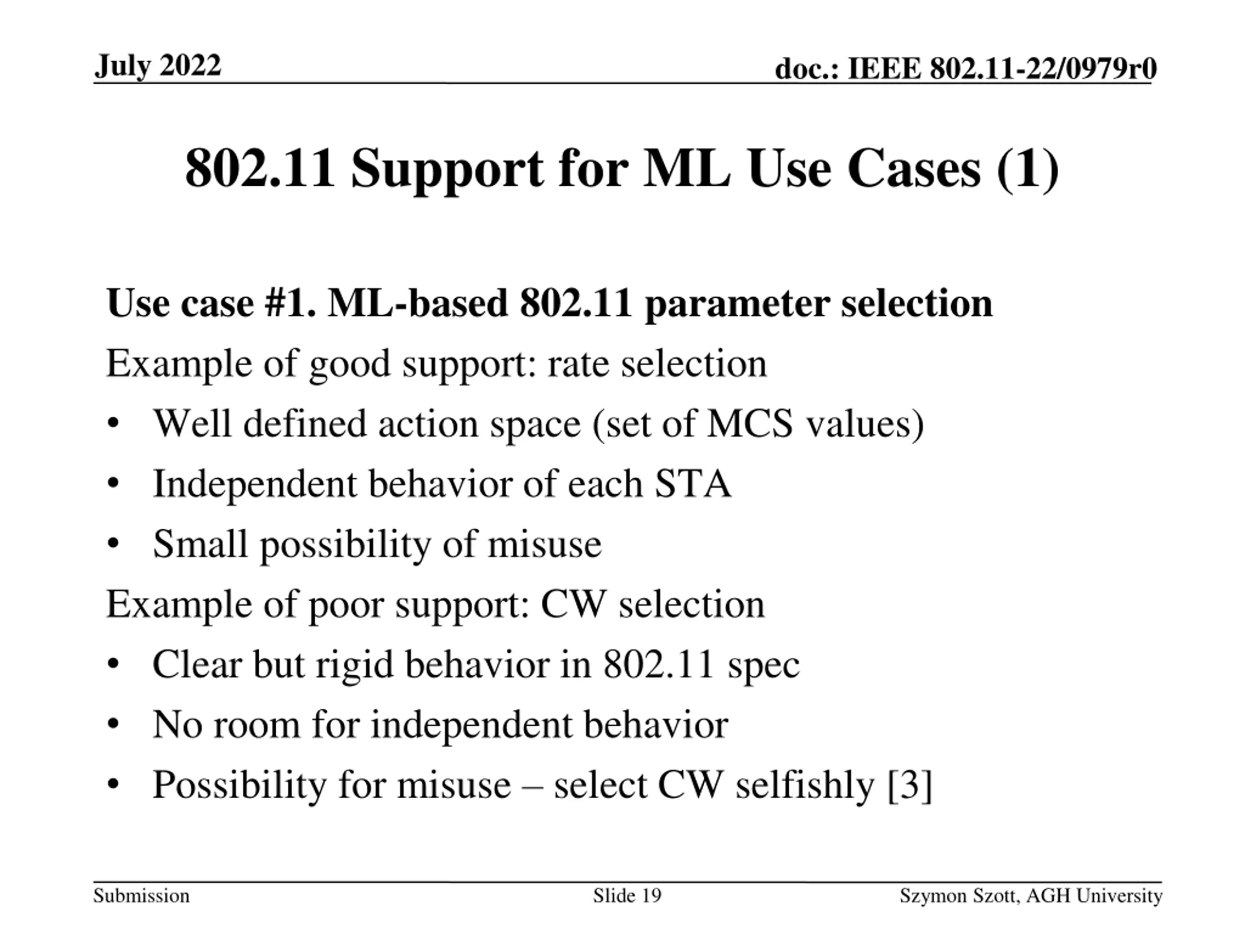 July 2022 doc.: IEEE 802.11-22/0979r0 802.11 Support for ML Use Cases (1) Use case #1. ML-based 802.11 parameter selection Example of good support: rate selection Well defined action space (set of MCS values) Independent behavior of each STA Small possibility of misuse Example of poor support: CW selection Clear but rigid behavior in 802.11 spec No room for independent behavior Possibility for misuse select CW selfishly [3] Submission Slide 19 Szymon Szott, AGH University