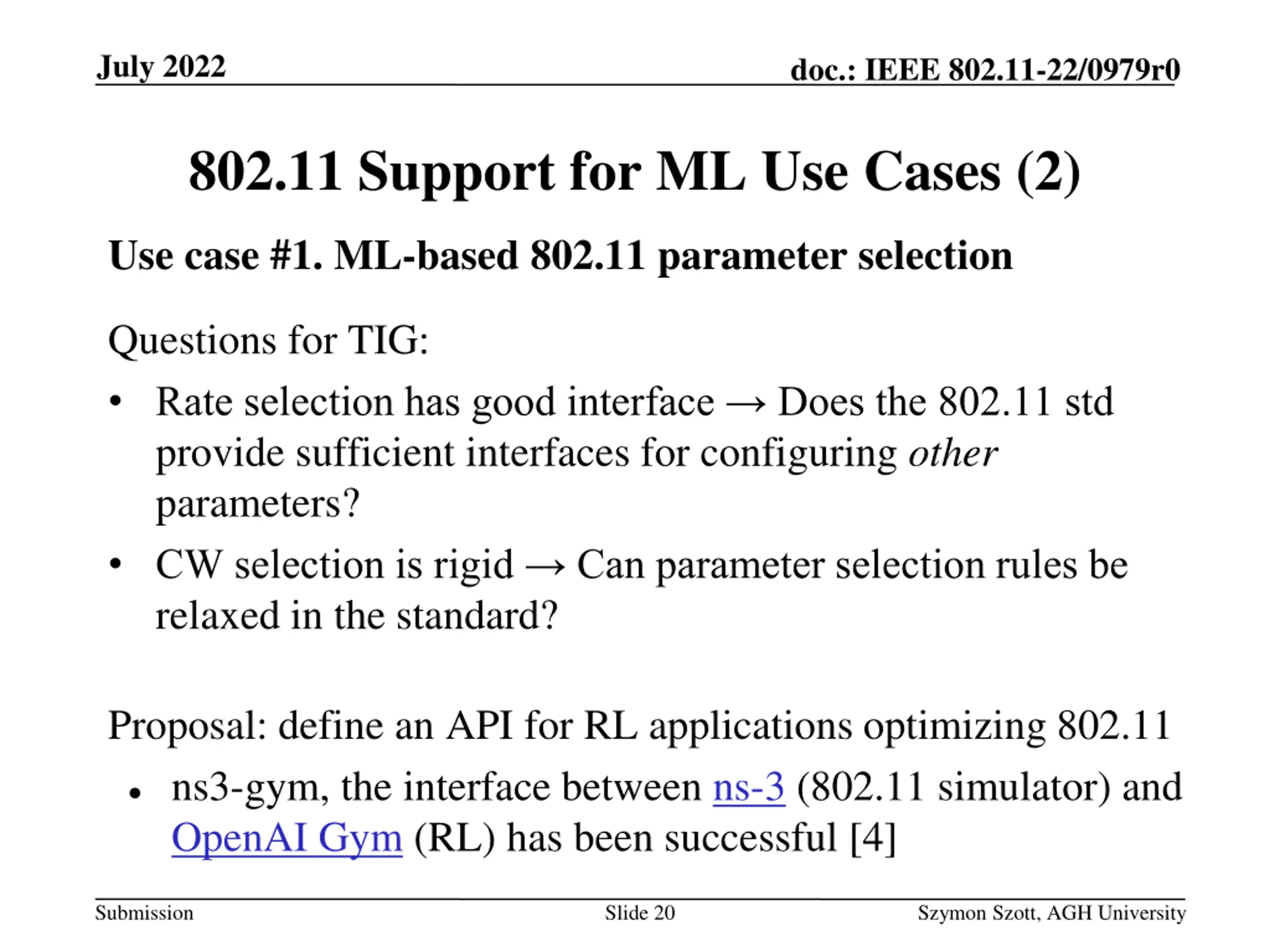 July 2022 doc.: IEEE 802.11-22/0979r0 802.11 Support for ML Use Cases (2) Use case #1. ML-based 802.11 parameter selection Questions for TIG: Rate selection has good interface Does the 802.11 std provide sufficient interfaces for configuring other parameters? CW selection is rigid Can parameter selection rules be relaxed in the standard? Proposal: define an API for RL applications optimizing 802.11 ns3-gym, the interface between ns-3 (802.11 simulator) and OpenAI Gym (RL) has been successful [4] Submission Slide 20 Szymon Szott, AGH University
