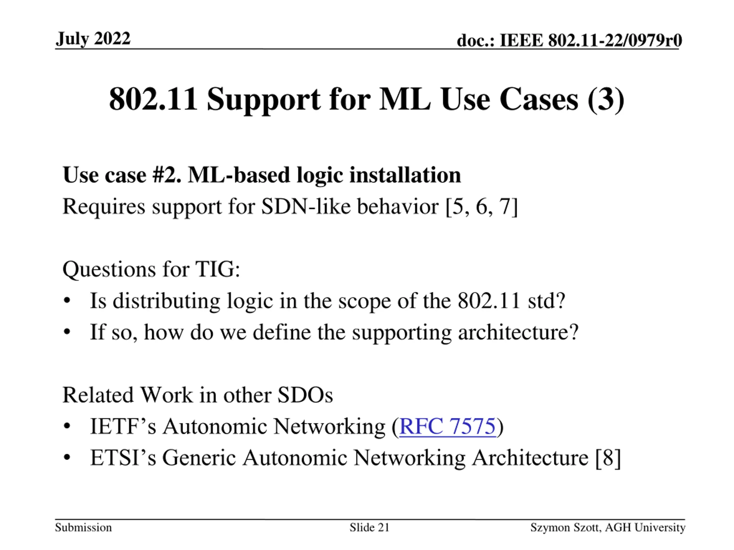 July 2022 doc.: IEEE 802.11-22/0979r0 802.11 Support for ML Use Cases (3) Use case #2. ML-based logic installation Requires support for SDN-like behavior [5, 6, 7] Questions for TIG: Is distributing logic in the scope of the 802.11 std? If so, how do we define the supporting architecture? Related Work in other SDOs IETF s Autonomic Networking (RFC 7575) ETSI s Generic Autonomic Networking Architecture [8] Submission Slide 21 Szymon Szott, AGH University