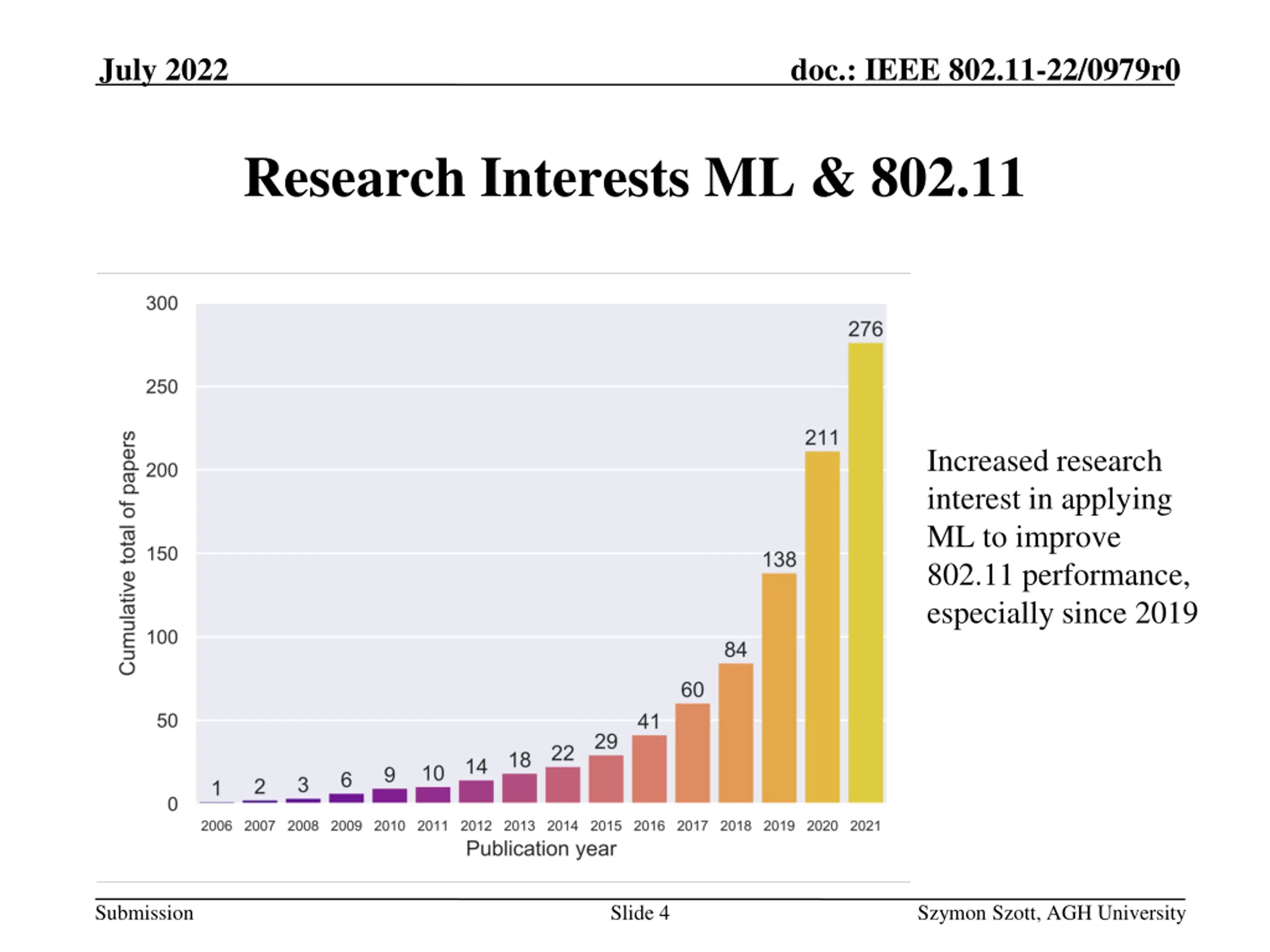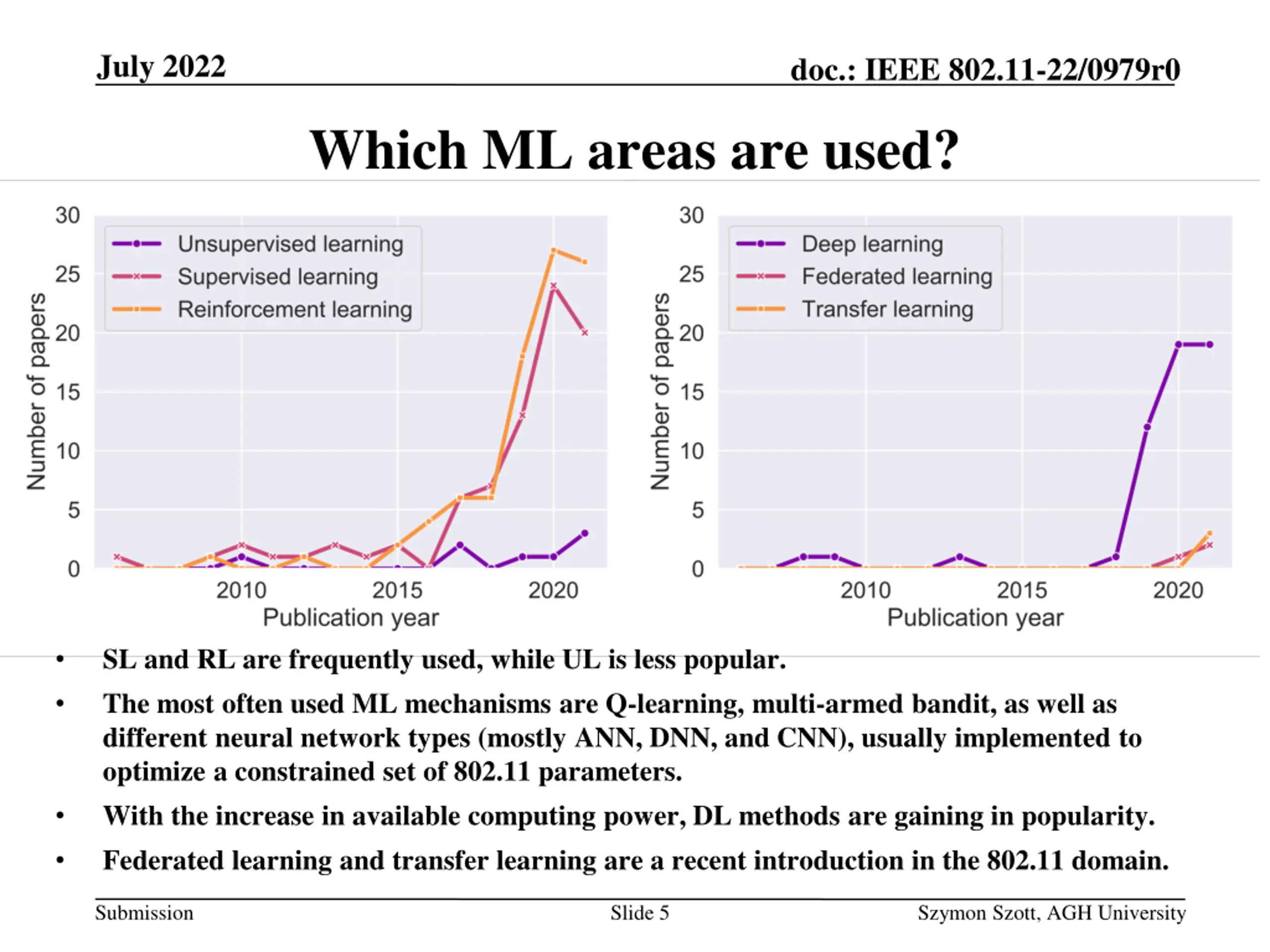 July 2022 doc.: IEEE 802.11-22/0979r0 Research Interests ML & 802.11 Increased research interest in applying ML to improve 802.11 performance, especially since 2019 Submission Slide 4 Szymon Szott, AGH University