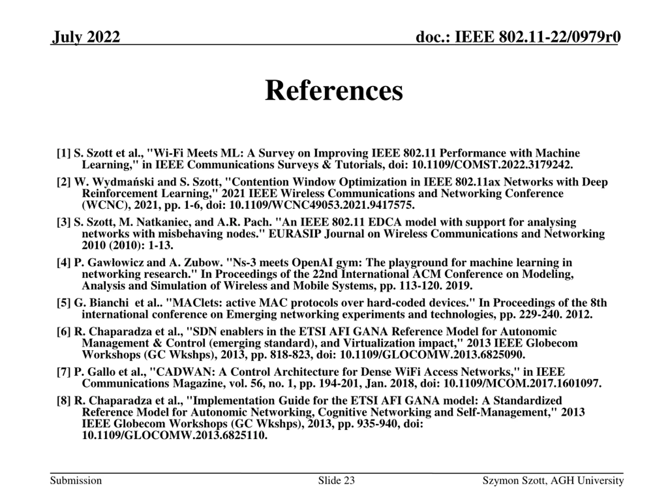 July 2022 doc.: IEEE 802.11-22/0979r0 References [1] S. Szott et al., "Wi-Fi Meets ML: A Survey on Improving IEEE 802.11 Performance with Machine Learning," in IEEE Communications Surveys & Tutorials, doi: 10.1109/COMST.2022.3179242. [2] W. Wydma ski and S. Szott, "Contention Window Optimization in IEEE 802.11ax Networks with Deep Reinforcement Learning," 2021 IEEE Wireless Communications and Networking Conference (WCNC), 2021, pp. 1-6, doi: 10.1109/WCNC49053.2021.9417575. [3] S. Szott, M. Natkaniec, and A.R. Pach. "An IEEE 802.11 EDCA model with support for analysing networks with misbehaving nodes." EURASIP Journal on Wireless Communications and Networking 2010 (2010): 1-13. [4] P. Gaw owicz and A. Zubow. "Ns-3 meets OpenAI gym: The playground for machine learning in networking research." In Proceedings of the 22nd International ACM Conference on Modeling, Analysis and Simulation of Wireless and Mobile Systems, pp. 113-120. 2019. [5] G. Bianchi et al.. "MAClets: active MAC protocols over hard-coded devices." In Proceedings of the 8th international conference on Emerging networking experiments and technologies, pp. 229-240. 2012. [6] R. Chaparadza et al., "SDN enablers in the ETSI AFI GANA Reference Model for Autonomic Management & Control (emerging standard), and Virtualization impact," 2013 IEEE Globecom Workshops (GC Wkshps), 2013, pp. 818-823, doi: 10.1109/GLOCOMW.2013.6825090. [7] P. Gallo et al., "CADWAN: A Control Architecture for Dense WiFi Access Networks," in IEEE Communications Magazine, vol. 56, no. 1, pp. 194-201, Jan. 2018, doi: 10.1109/MCOM.2017.1601097. [8] R. Chaparadza et al., "Implementation Guide for the ETSI AFI GANA model: A Standardized Reference Model for Autonomic Networking, Cognitive Networking and Self-Management," 2013 IEEE Globecom Workshops (GC Wkshps), 2013, pp. 935-940, doi: 10.1109/GLOCOMW.2013.6825110. Submission Slide 23 Szymon Szott, AGH University