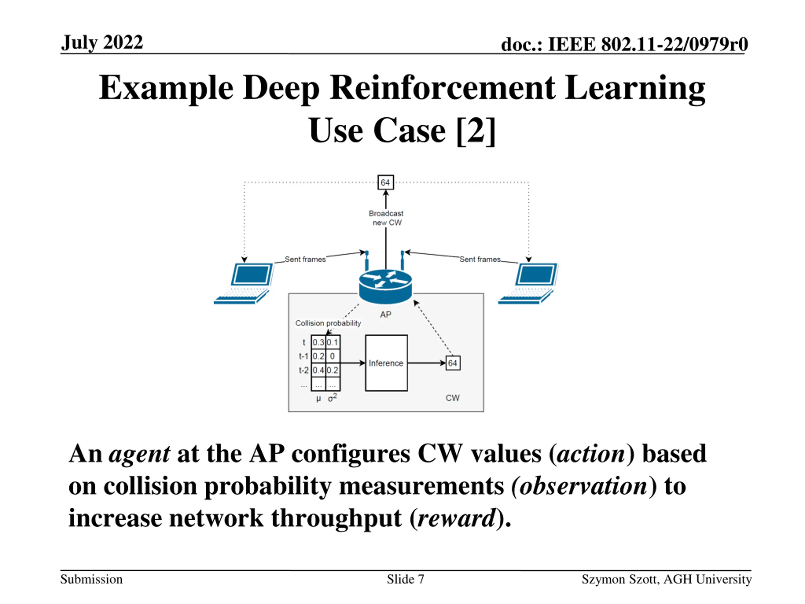 July 2022 doc.: IEEE 802.11-22/0979r0 Example Deep Reinforcement Learning Use Case [2] An agent at the AP configures CW values (action) based on collision probability measurements (observation) to increase network throughput (reward). Submission Slide 7 Szymon Szott, AGH University