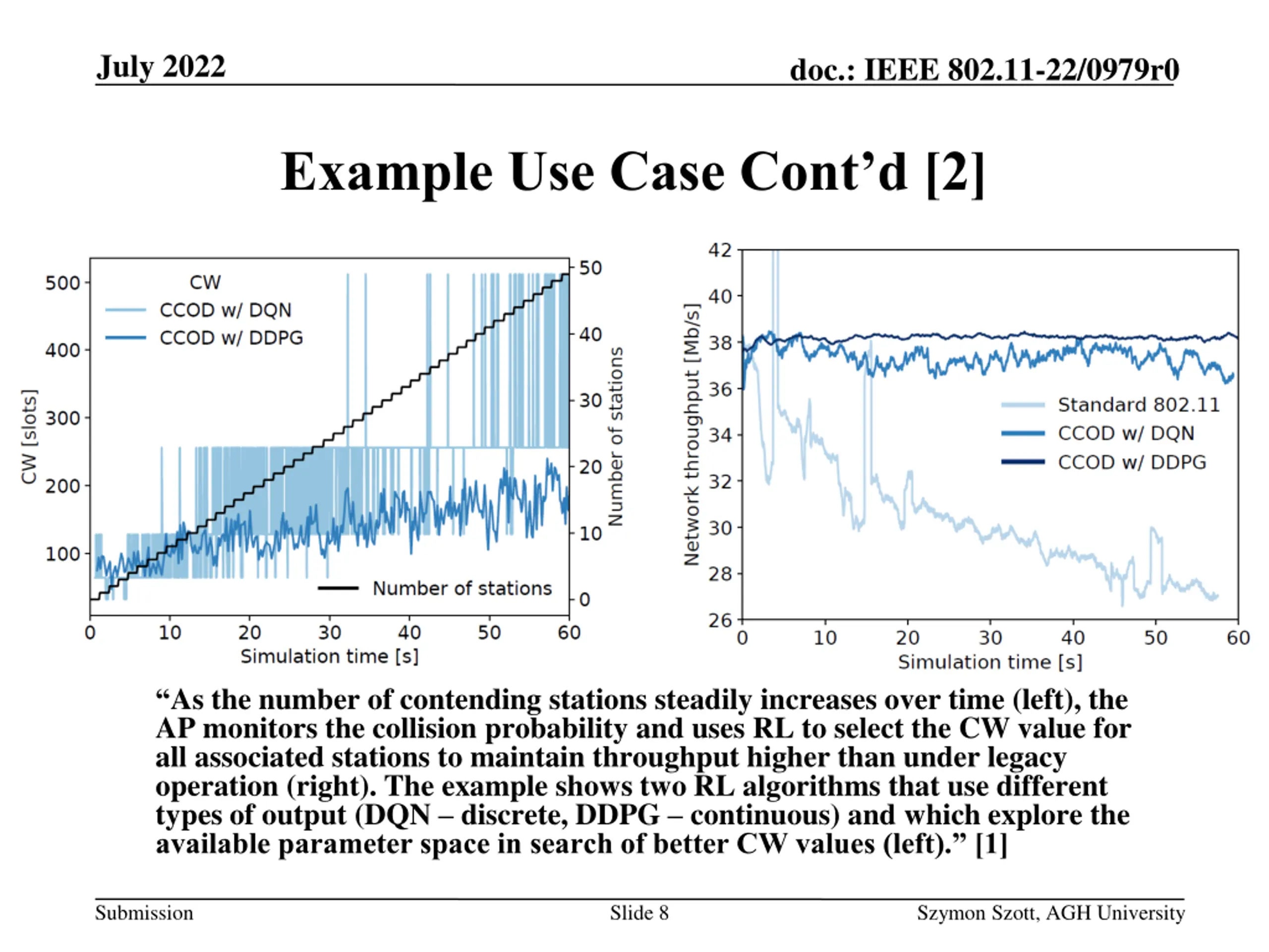 July 2022 doc.: IEEE 802.11-22/0979r0 Example Use Case Cont d [2] As the number of contending stations steadily increases over time (left), the AP monitors the collision probability and uses RL to select the CW value for all associated stations to maintain throughput higher than under legacy operation (right). The example shows two RL algorithms that use different types of output (DQN discrete, DDPG continuous) and which explore the available parameter space in search of better CW values (left). [1] Submission Slide 8 Szymon Szott, AGH University