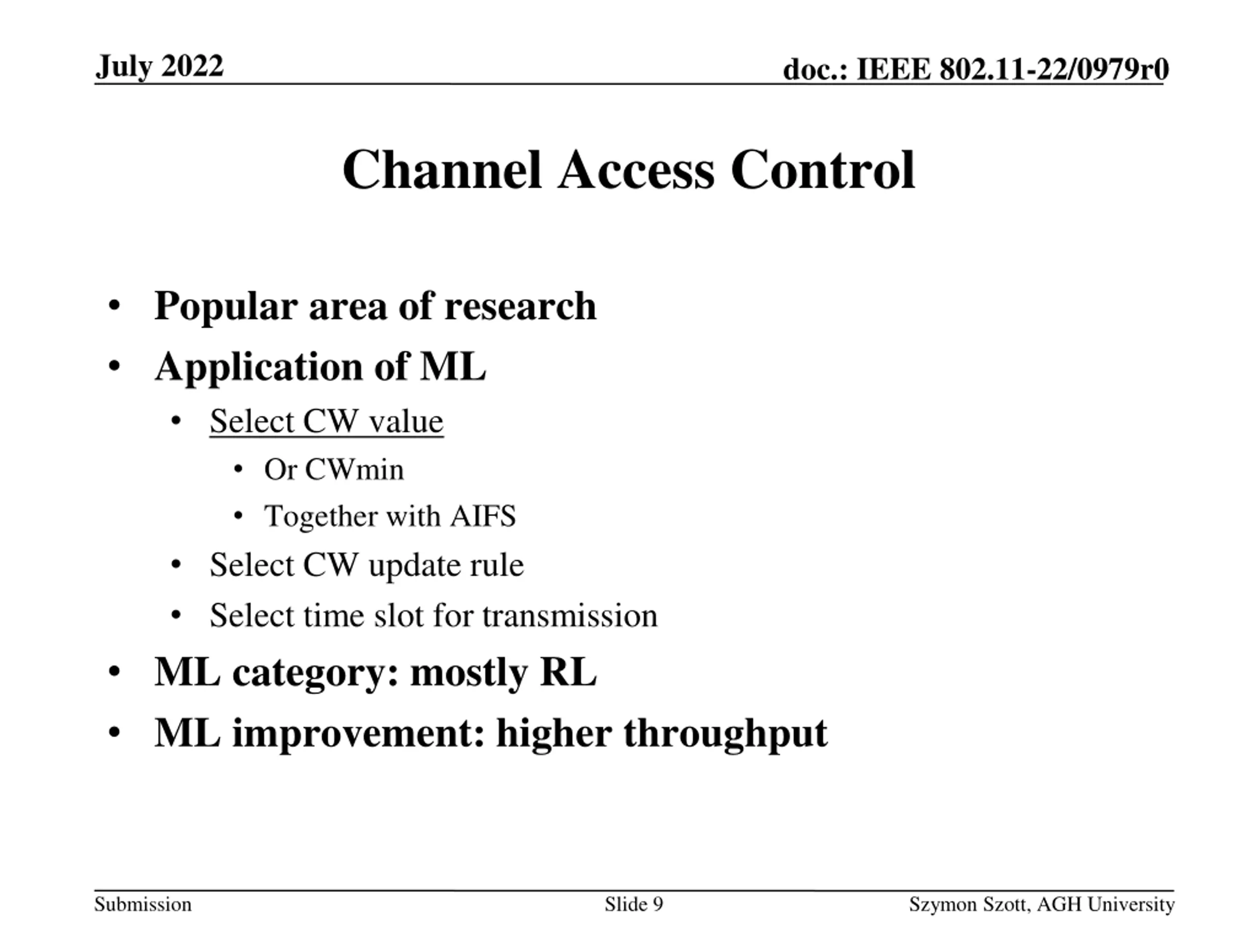 July 2022 doc.: IEEE 802.11-22/0979r0 Channel Access Control Popular area of research Application of ML Select CW value Or CWmin Together with AIFS Select CW update rule Select time slot for transmission ML category: mostly RL ML improvement: higher throughput Submission Slide 9 Szymon Szott, AGH University