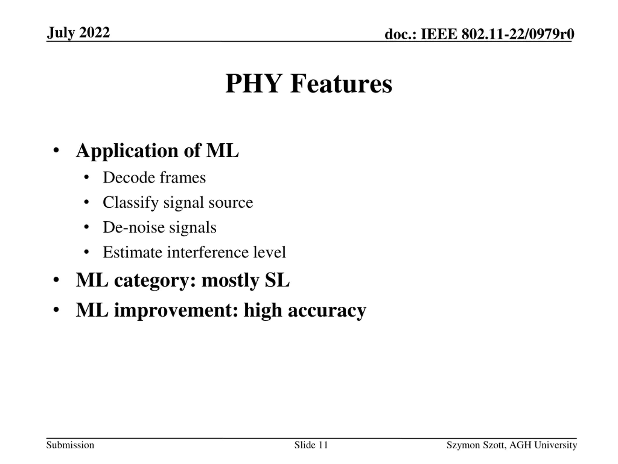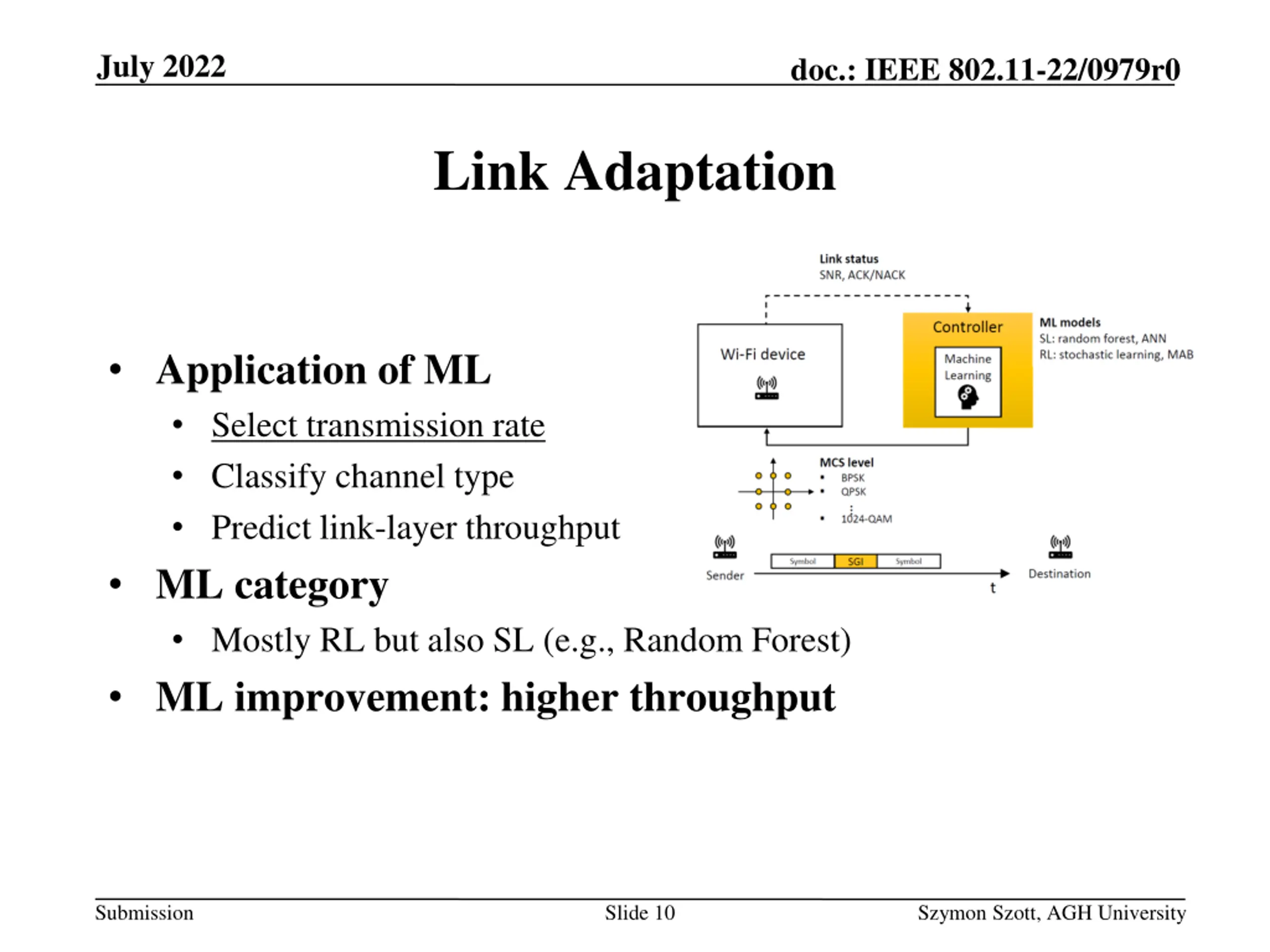 July 2022 doc.: IEEE 802.11-22/0979r0 Link Adaptation Application of ML Select transmission rate Classify channel type Predict link-layer throughput ML category Mostly RL but also SL (e.g., Random Forest) ML improvement: higher throughput Submission Slide 10 Szymon Szott, AGH University