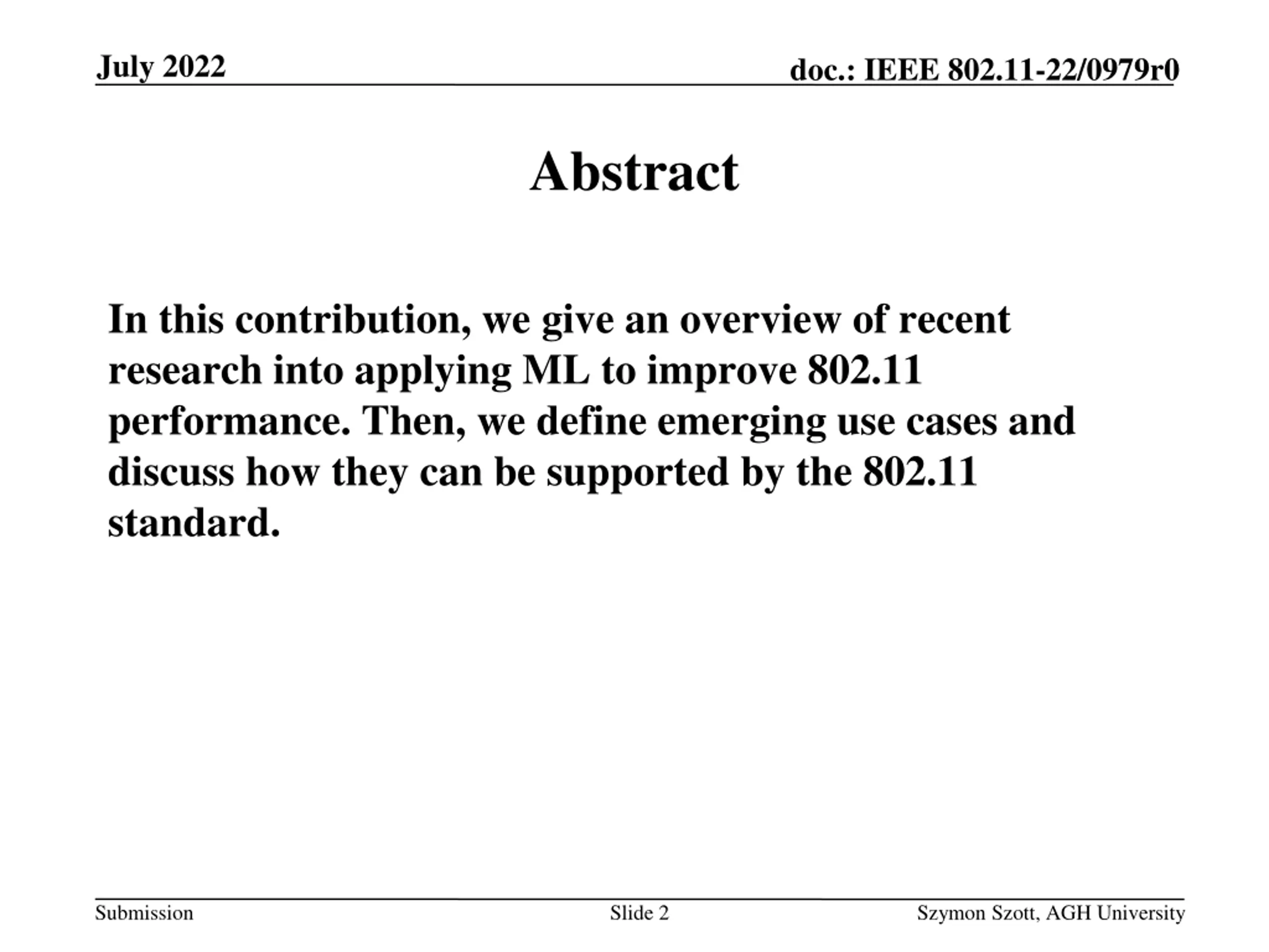 July 2022 doc.: IEEE 802.11-22/0979r0 Abstract In this contribution, we give an overview of recent research into applying ML to improve 802.11 performance. Then, we define emerging use cases and discuss how they can be supported by the 802.11 standard. Submission Slide 2 Szymon Szott, AGH University